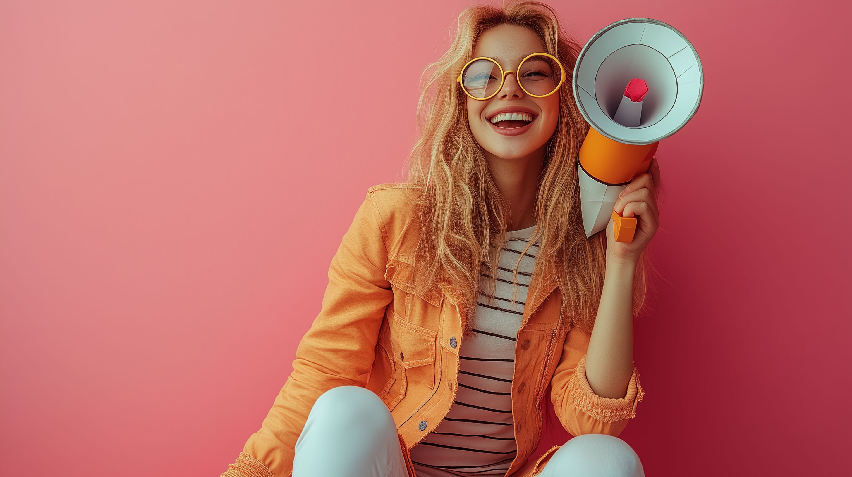 Das Bild zeigt eine junge, attraktive Frau mit langen, blonden Haaren, die lachend ein gelbes Megafon in der Hand hält. Sie trägt eine orange Jacke und eine gestreifte Bluse und sitzt entspannt vor einem einfarbigen, pinken Hintergrund. Durch die leuchtenden Farben und die offene, freundliche Haltung der Frau strahlt das Foto eine positive, energetische Stimmung aus.
