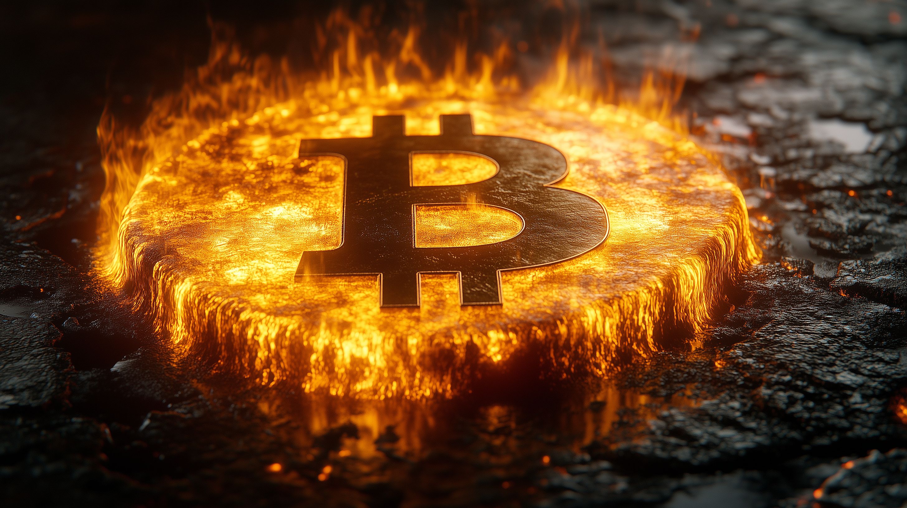 Das Bild zeigt eine brennende Bitcoin-Münze, die in lodernder Lava versinkt. Die Szene vermittelt ein bedrohliches Gefühl des Untergangs und Verlusts, wie es bei einem Kurssturz der Kryptowährung Bitcoin der Fall sein könnte. Die intensiven Farben, die kontrastreiche Komposition und die realistische 3D-Darstellung machen dieses Foto zu einem visuell beeindruckenden und aussagekräftigen Stockfoto, das sich ideal für Blogs, Newsletter, Social-Media-Posts oder Werbematerialien rund um das Thema Krypto-Finanzen eignet. Das hochauflösende Bild steht unter einer Creative-Commons-Lizenz kostenlos zur Verfügung.