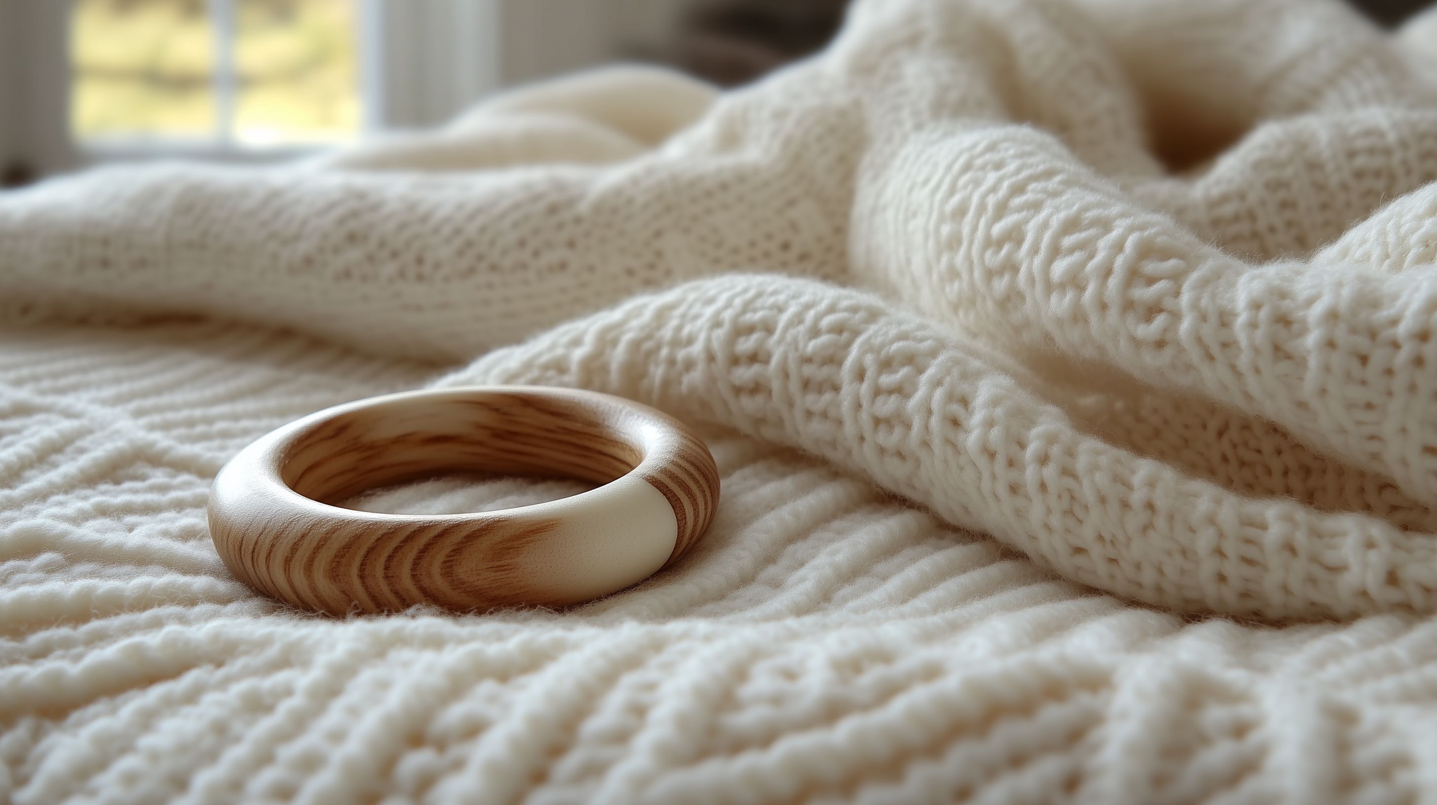 Dieses stimmungsvolle Foto zeigt ein einfaches, aber elegantes Holzschmuckstück, eingebettet in eine kuschelige weiße Wolldecke. Die warmen Farbtöne und die weichen Texturen schaffen eine natürliche, gemütliche Atmosphäre. Dieses Stockfoto eignet sich hervorragend für Blogbeiträge, Newsletter-Designs oder Werbe-Visuals in den Bereichen Lifestyle, Handwerkskunst oder Geschenkideen. Das hochauflösende Bild steht unter der Creative-Commons-Lizenz und kann kostenfrei verwendet werden.