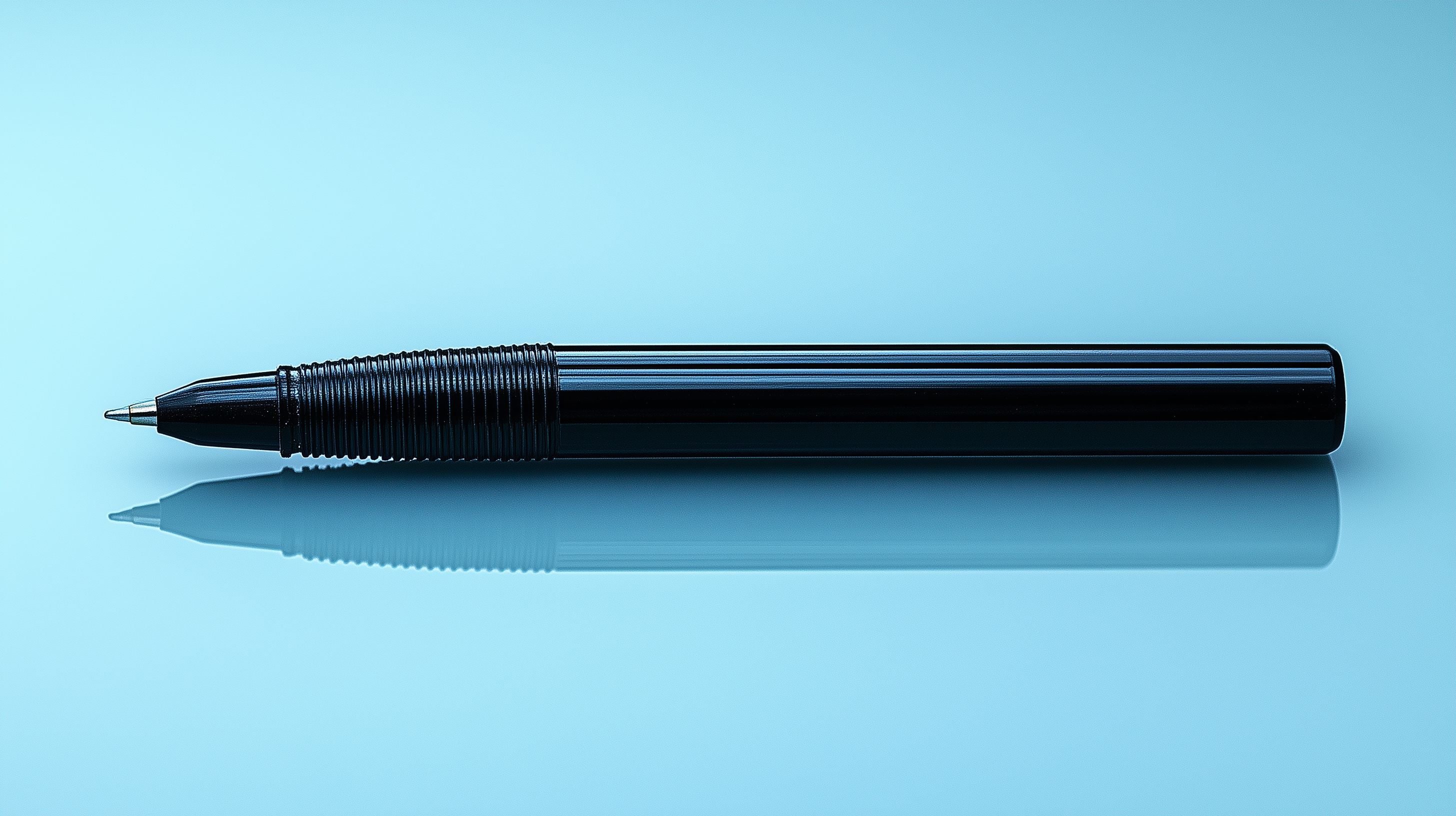 Das Foto zeigt einen schwarzen Stift oder Kugelschreiber, der vor einem türkisblauen Hintergrund liegt. Der Stift ist gerade und liegt horizontal auf der Oberfläche, was eine minimalistisch-moderne Ästhetik schafft. Die Reflexion des Stifts auf der glatten, reflektierenden Oberfläche unterstreicht diesen Eindruck. Die Farbwahl von Schwarz und Türkis erzeugt einen klaren, frischen und einladenden Kontrast, der sich gut für diverse Anwendungen wie Werbung, Grafiken oder Präsentationen eignet. Dieses hochauflösende, kostenlose Stockfoto unter Creative-Commons-Lizenz bietet viel Raum für kreative Gestaltung und Inspiration.