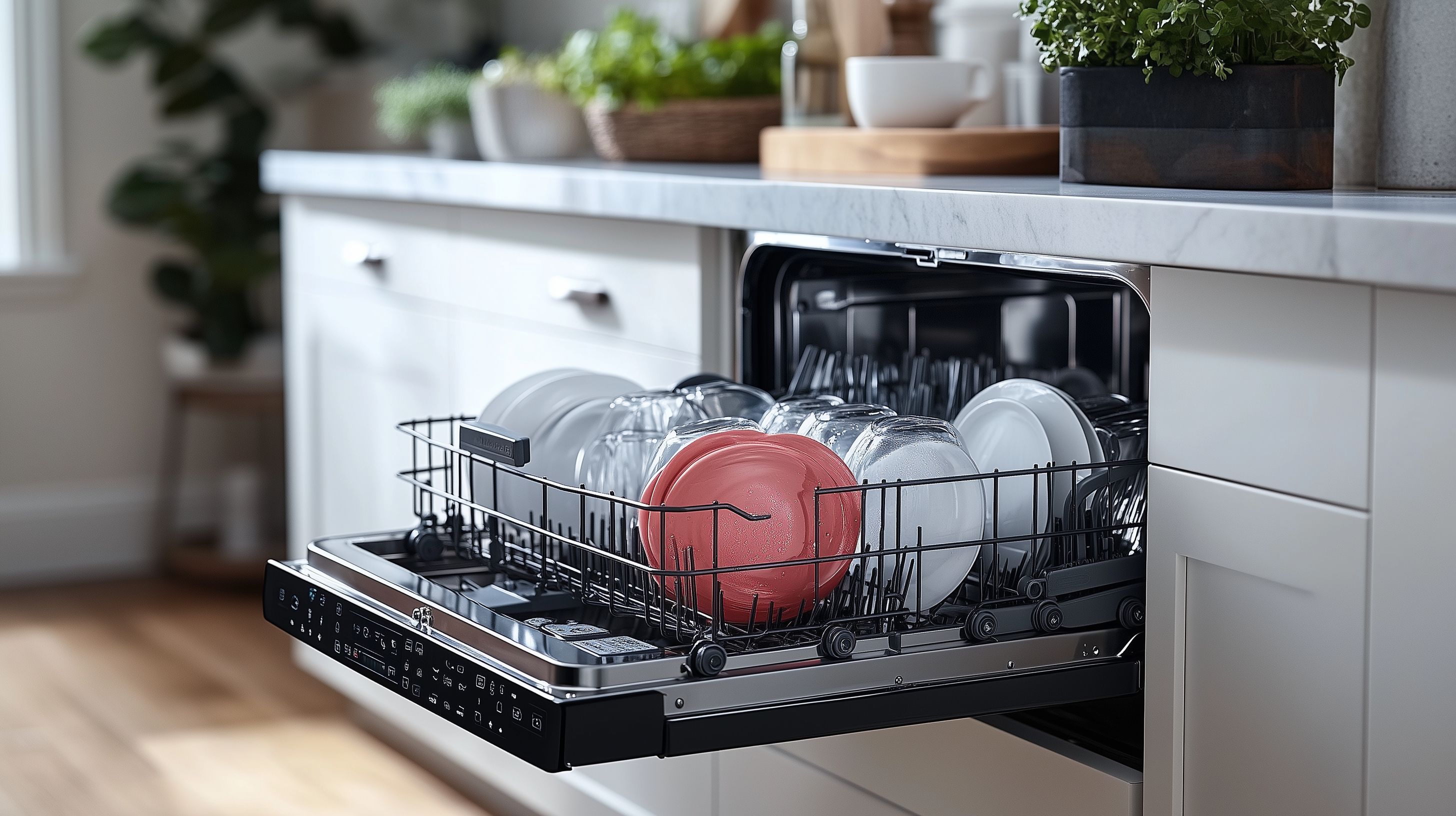 Das Foto zeigt eine offene Spülmaschine, die mit sauberem Geschirr, Gläsern und Besteck ordentlich eingeräumt ist. Die Maschine befindet sich in einer modernen Küche mit weißen Fronten und Holzakzenten. Die Anordnung der Geschirrteile lässt auf eine effiziente Nutzung des Innenraums schließen. Dieses Stockfoto in hoher Auflösung eignet sich ideal für den Einsatz in Blogbeiträgen, Newslettern oder Social-Media-Werbung rund um Themen wie Haushaltsführung, Ordnung und Sauberkeit in der Küche. Es steht unter einer Creative-Commons-Lizenz zum kostenlosen Download zur Verfügung.