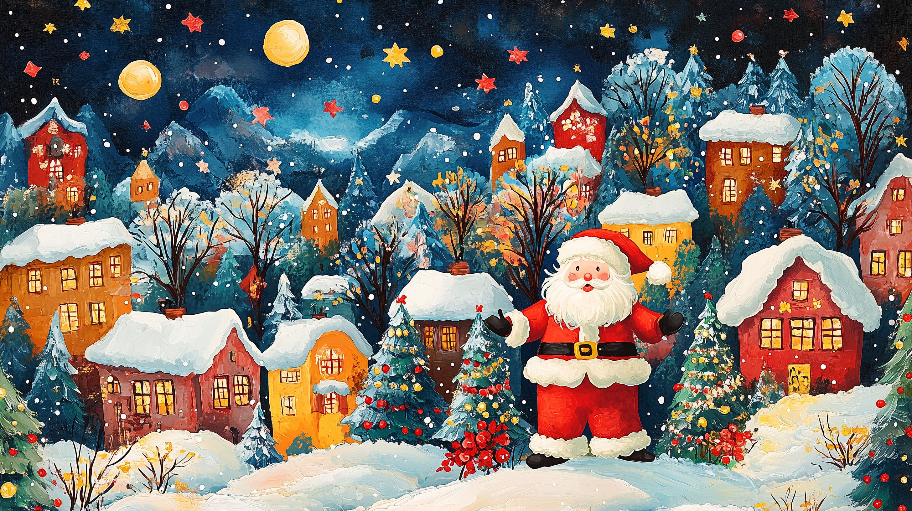 Dieses stimmungsvolle Weihnachtsbild zeigt eine malerische Winterlandschaft mit verschneiten Häusern, beleuchteten Fenstern und einem fröhlichen Weihnachtsmann, der durch die Schneelandschaft spaziert. Im Hintergrund sind beleuchtete Tannen und eine Bergkulisse zu sehen, während der Himmel mit Sternen und zwei Vollmonden übersät ist. Die Szene strahlt eine märchenhafte, gemütliche Atmosphäre aus und eignet sich perfekt als Hintergrundbild für Weihnachtsgrüße, Werbung oder Festtagskampagnen. Dieses hochauflösende, kostenfreie Stockfoto steht unter Creative-Commons-Lizenz zur Verfügung.