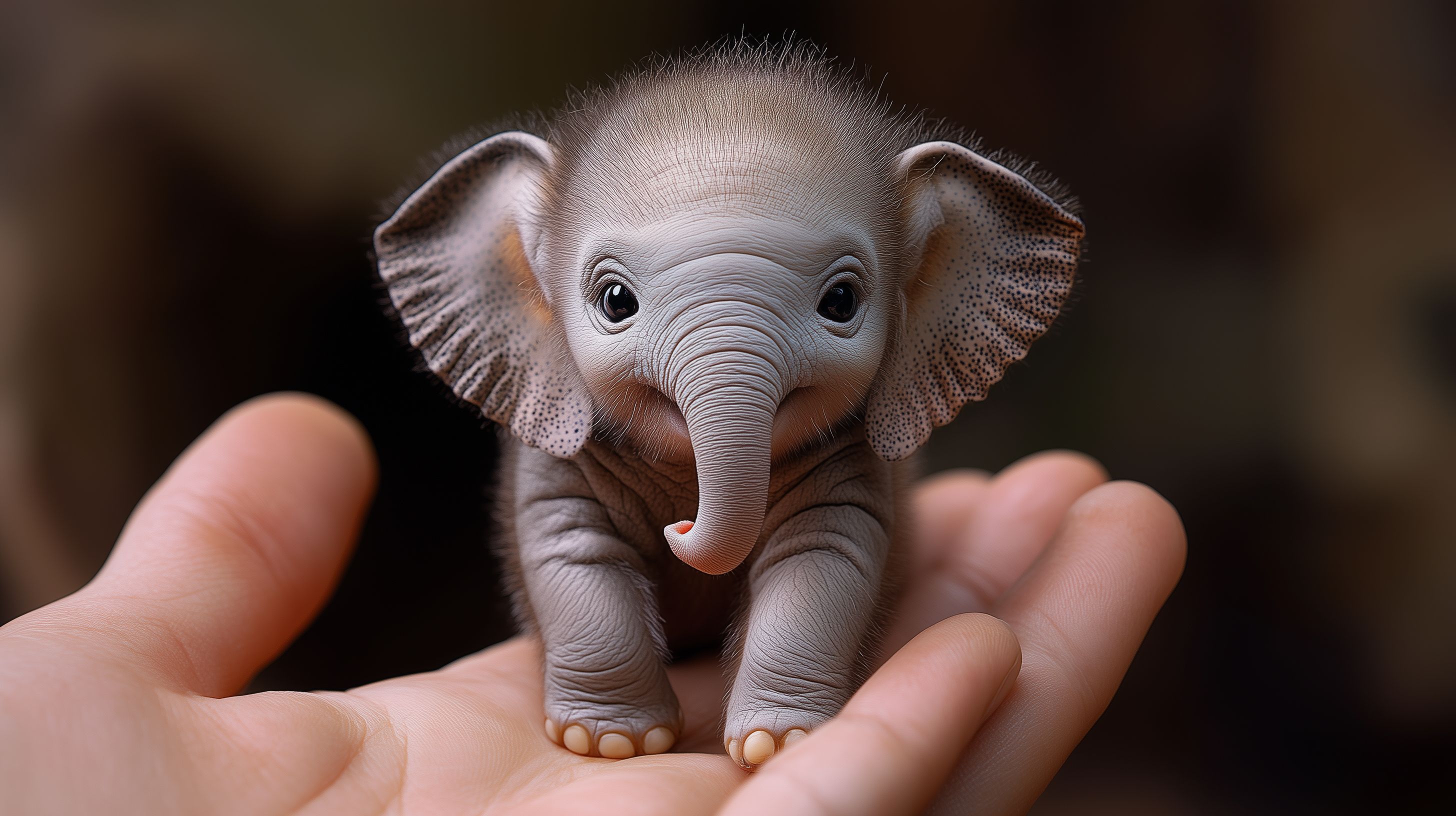 Das Bild zeigt ein entzückendes, frisch geborenes Elefantenbaby, das auf der ausgestreckten Hand eines Menschen zu sehen ist. Der kleine Elefant mit seinem charakteristischen langen Rüssel blickt den Betrachter aus großen, dunklen Augen an. Die Kombination aus der zerbrechlichen Gestalt des Tieres und der schützenden Geste der Menschenhand erzeugt einen rührenden Eindruck von Fürsorge und Zärtlichkeit.