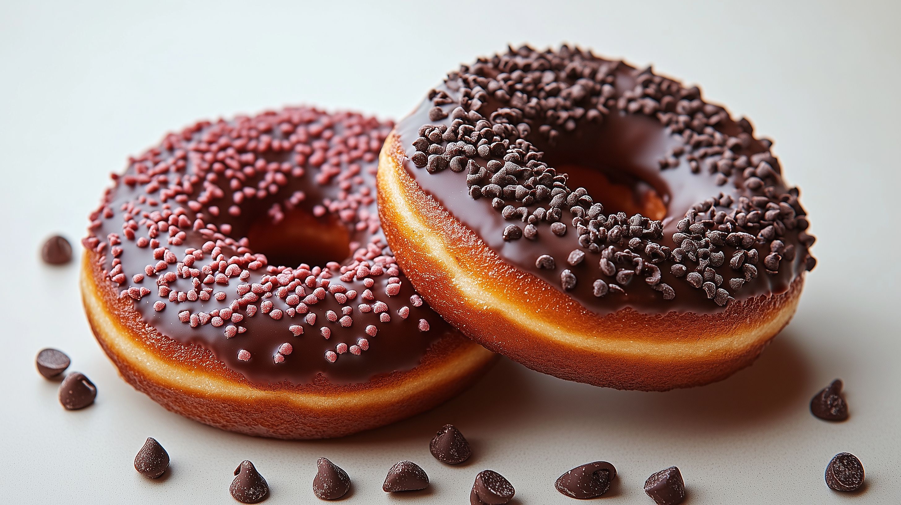 Dieses Foto zeigt zwei frisch zubereitete Schokoladen-Donuts, die mit einer dunklen Schokoladenglasur und feinen Schokoladenstreusel überzogen sind. Die üppige Dekoration verleiht den Leckereien einen sinnlichen, appetitanregenden Charakter. Die Nahaufnahme betont die detailreiche Textur und Farbgebung der Donuts, die sich perfekt für den Einsatz in Lebensmittel-, Genuss- und Gastronomiebeiträgen eignen. Dieses hochauflösende Stockfoto steht unter einer Creative-Commons-Lizenz und kann kostenfrei für verschiedene Zwecke, wie Blogbeiträge, Social-Media-Kanäle oder Werbekampagnen, verwendet werden.