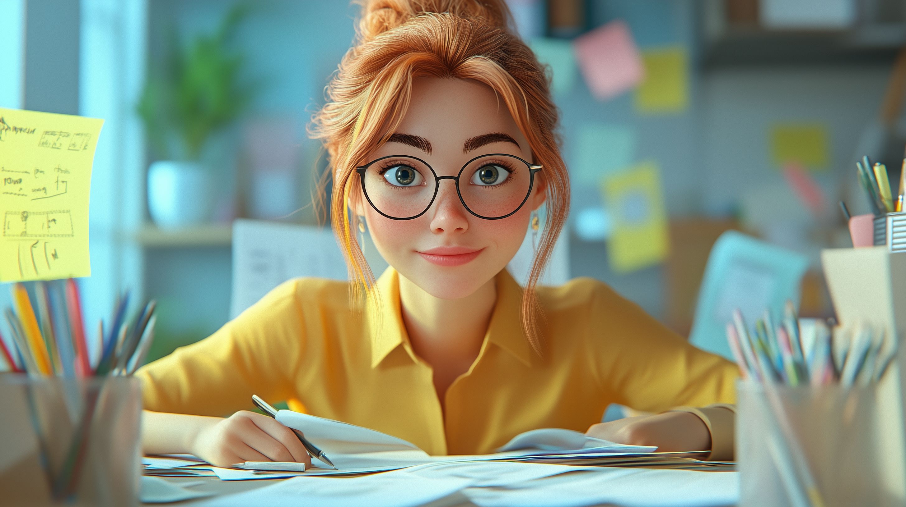 Dieses freundliche und farbenfrohe Stockfoto zeigt eine lächelnde junge Frau, die konzentriert an ihrem Schreibtisch arbeitet. Sie trägt eine Brille und hält Notizzettel in der Hand, während sie an einem Computer oder Laptop schreibt. Umgeben ist sie von Büromaterialien wie Stiften, Mappen und einem Whiteboard. Das Foto vermittelt einen kreativen und motivierten Eindruck und lässt sich ideal in Blogbeiträgen, Newsletter-Designs, Social-Media-Posts oder Werbematerialien zum Thema Büroarbeit, Studium oder Kreativität einsetzen. Dieses hochauflösende und kostenlose Stockfoto steht unter einer Creative-Commons-Lizenz zur Verfügung.