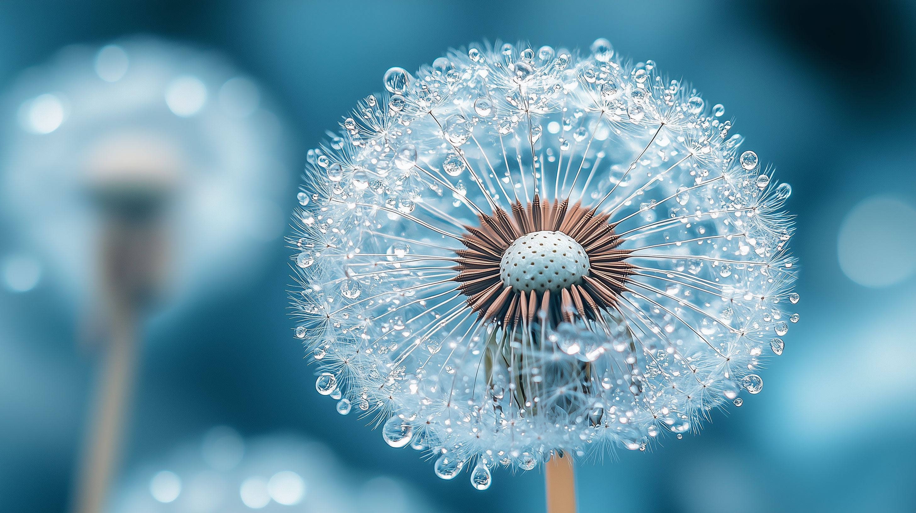 Dieses stimmungsvolle Foto zeigt eine wunderschöne Nahaufnahme einer Pusteblume, deren filigranen Blütenköpfchen mit unzähligen glitzernden Wassertropfen bedeckt sind. Die Blume hebt sich vor einem unscharfen, blauen Hintergrund ab, der der Szene eine kühle, frische Atmosphäre verleiht. Das Bild besticht durch seine faszinierende Detailgenauigkeit, die die zarte Struktur und Perfektion der Natur eindrucksvoll in Szene setzt. Dieses hochwertige Stockfoto in hoher Auflösung ist ideal für den Einsatz in Blogs, Newslettern, Social-Media-Beiträgen oder Werbekampagnen rund um die Themen Natur, Frühling, Botanik und Makrofotografie. Es steht unter einer Creative-Commons-Lizenz zur freien Nutzung zur Verfügung.