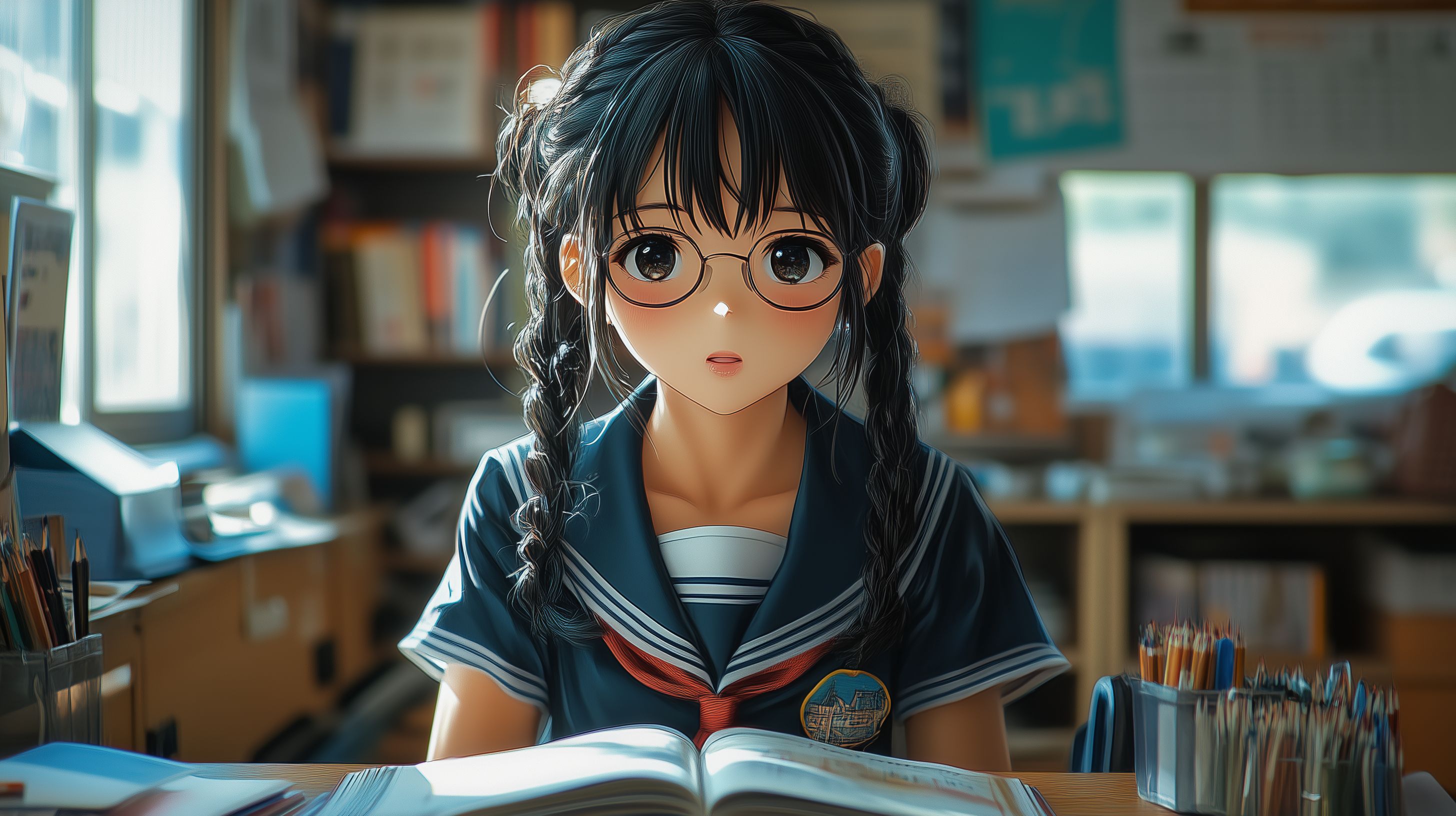 Das Bild zeigt eine konzentrierte Anime-Schülerin, die in einem gemütlichen Klassenzimmer sitzt und eifrig in einem Buch liest. Sie trägt eine detailreiche Schuluniform mit Krawatte und Brille und hat lange, dunkle Haare. Der Hintergrund ist unscharf, mit Regalen voller Bücher und anderen Utensilien. Das Foto vermittelt einen ruhigen, studiösen Eindruck und könnte ideal für Bildungsinhalte, Lerntipps oder ähnliche Kontexte eingesetzt werden. Als kostenloses Stockfoto in hoher Auflösung und unter Creative-Commons-Lizenz lässt es sich vielseitig in Blog-Beiträgen, Newslettern oder Social-Media-Posts verwenden.