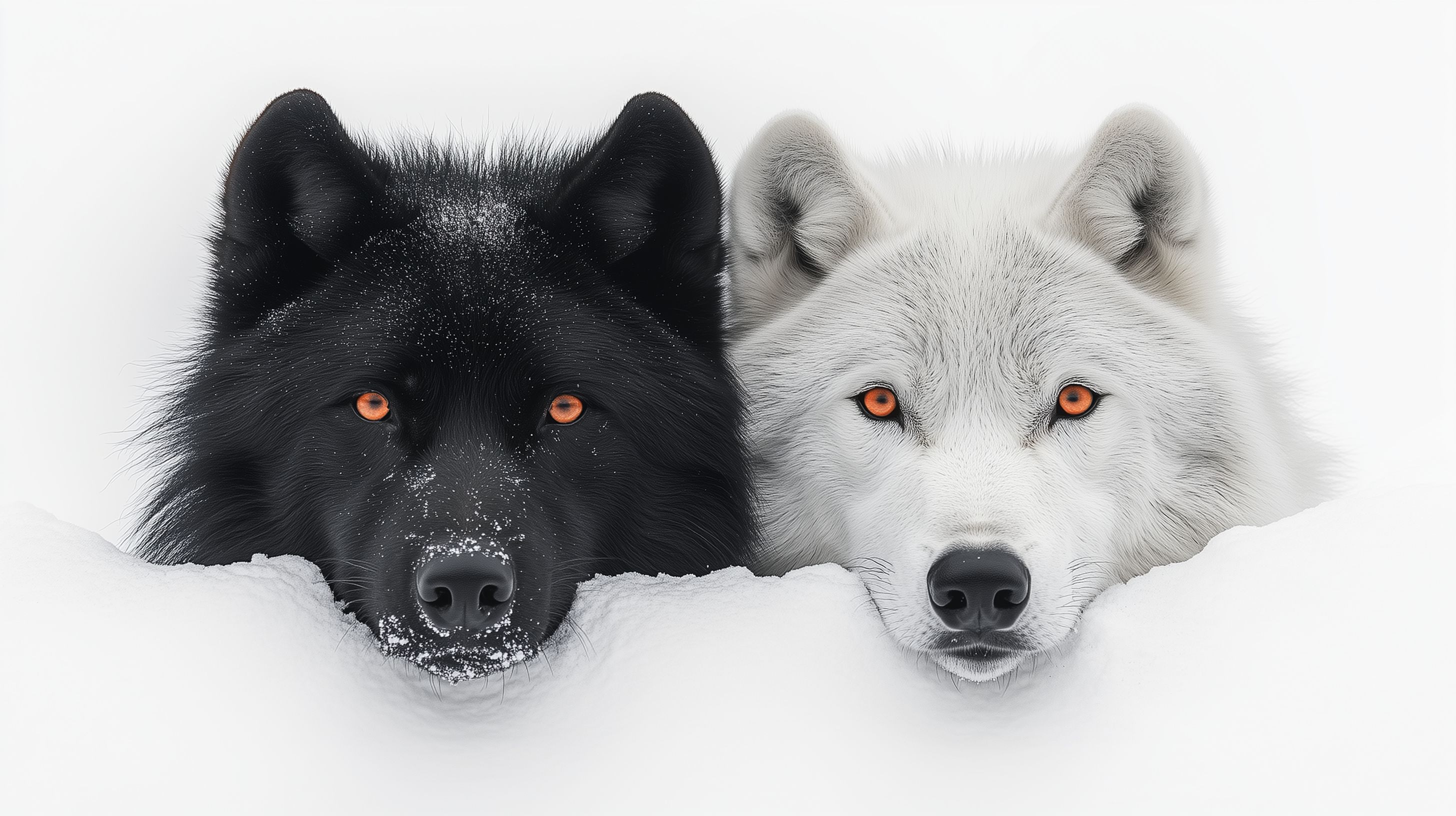 Das Bild zeigt zwei majestätische Polarwölfe, die tief aus dem Schnee hervorblicken. Der eine Wolf hat ein glänzendes schwarzes Fell, der andere ein leuchtendes Weiß. Ihre orangefarbenen Augen strahlen eine faszinierende Intensität aus, die den Betrachter in ihren Bann zieht. Die Tiere thronen in einer winterlichen Schneelandschaft, die einen starken Kontrast zu ihren Fellen bildet. Dieses beeindruckende Foto eignet sich perfekt für den Einsatz in Blogs, Newslettern, Social-Media-Kampagnen oder auch für Werbe- und Marketingzwecke. Als hochauflösendes Stockfoto unter einer Creative-Commons-Lizenz kann es kostenlos heruntergeladen und vielseitig verwendet werden.