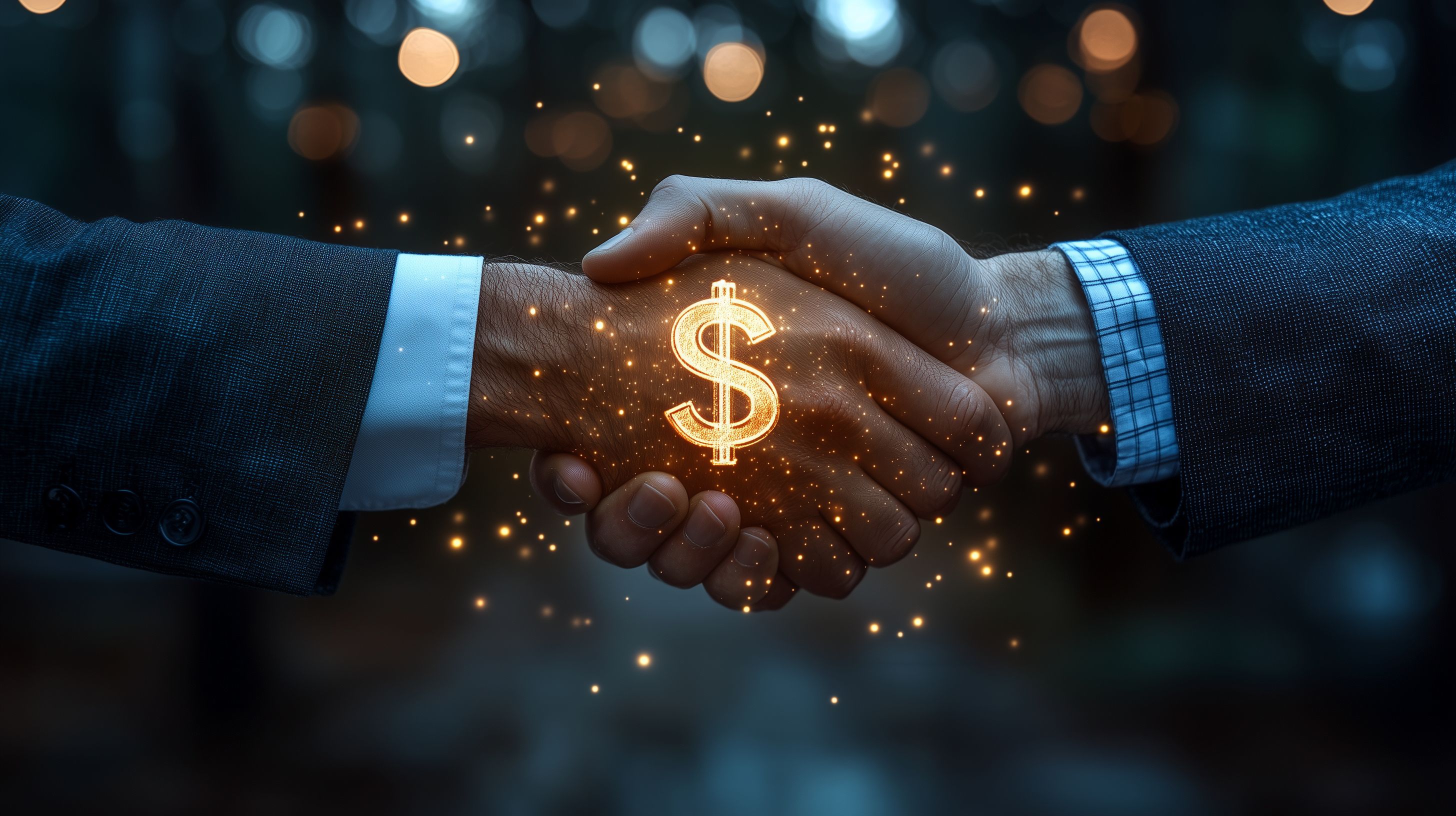 Dieses Stockfoto zeigt zwei Geschäftsleute, die sich die Hand geben. Zwischen ihren Händen erscheint ein leuchtendes Dollarzeichen, das die finanzielle und geschäftliche Partnerschaft symbolisiert. Die Szene spielt vor einem verschwommenen Hintergrund mit funkelnden Lichteffekten, die eine dynamische und innovative Atmosphäre schaffen.