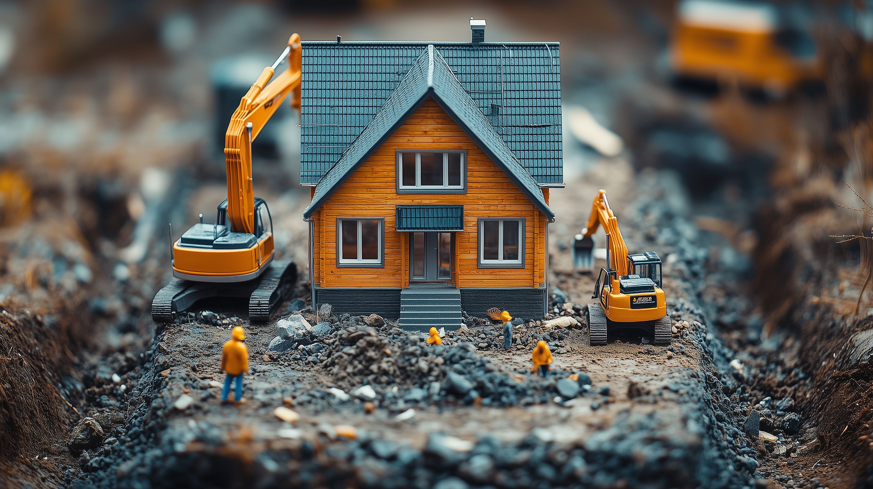 Das Bild zeigt ein Modell eines holzverkleideten Einfamilienhauses auf einer Baustelle mit Miniatur-Baumaschinen. Das Haus steht auf einem Hügel aus Kies und Geröll, umgeben von einer kargen Landschaft. Die orangefarbenen Bagger und ein Kran suggerieren, dass der Häuserbau noch in vollem Gange ist. Das Foto vermittelt den Eindruck eines neuen Bauvorhabens in einer natürlichen Umgebung. Es eignet sich ideal als kostenloses Stockfoto für Blog-Beiträge, Newsletter oder Social-Media-Kanäle rund um Immobilien, Architektur, Konstruktion oder Umweltthemen. Das hochauflösende Bild steht unter einer Creative-Commons-Lizenz zur freien Nutzung zur Verfügung.
