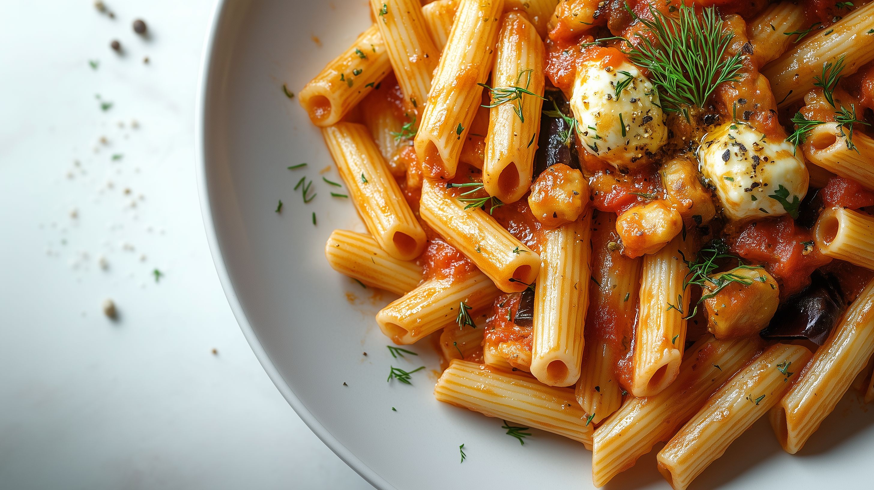 Dieses appetitlich angerichtete Foto zeigt eine Portion der italienischen Spezialität Pasta alla Norma. Die Nudeln sind mit einer würzigen Tomatensauce, Auberginenwürfeln, Oliven und frischen Kräutern serviert und in einer rustikalen Schüssel präsentiert. Die kräftigen Rottöne, kombiniert mit dem knackigen Grün der Kräuter, schaffen eine mediterrane Optik, die Appetit auf ein leckeres und gesundes Mittagessen oder Abendessen macht. Als kostenloses Stockfoto in hoher Auflösung und unter der Creative Commons-Lizenz ist dieses Bild ideal für die Verwendung in Blogs, Newslettern oder Social-Media-Beiträgen zum Thema Italienische Küche, Vegetarische Rezepte oder Kulinarik.