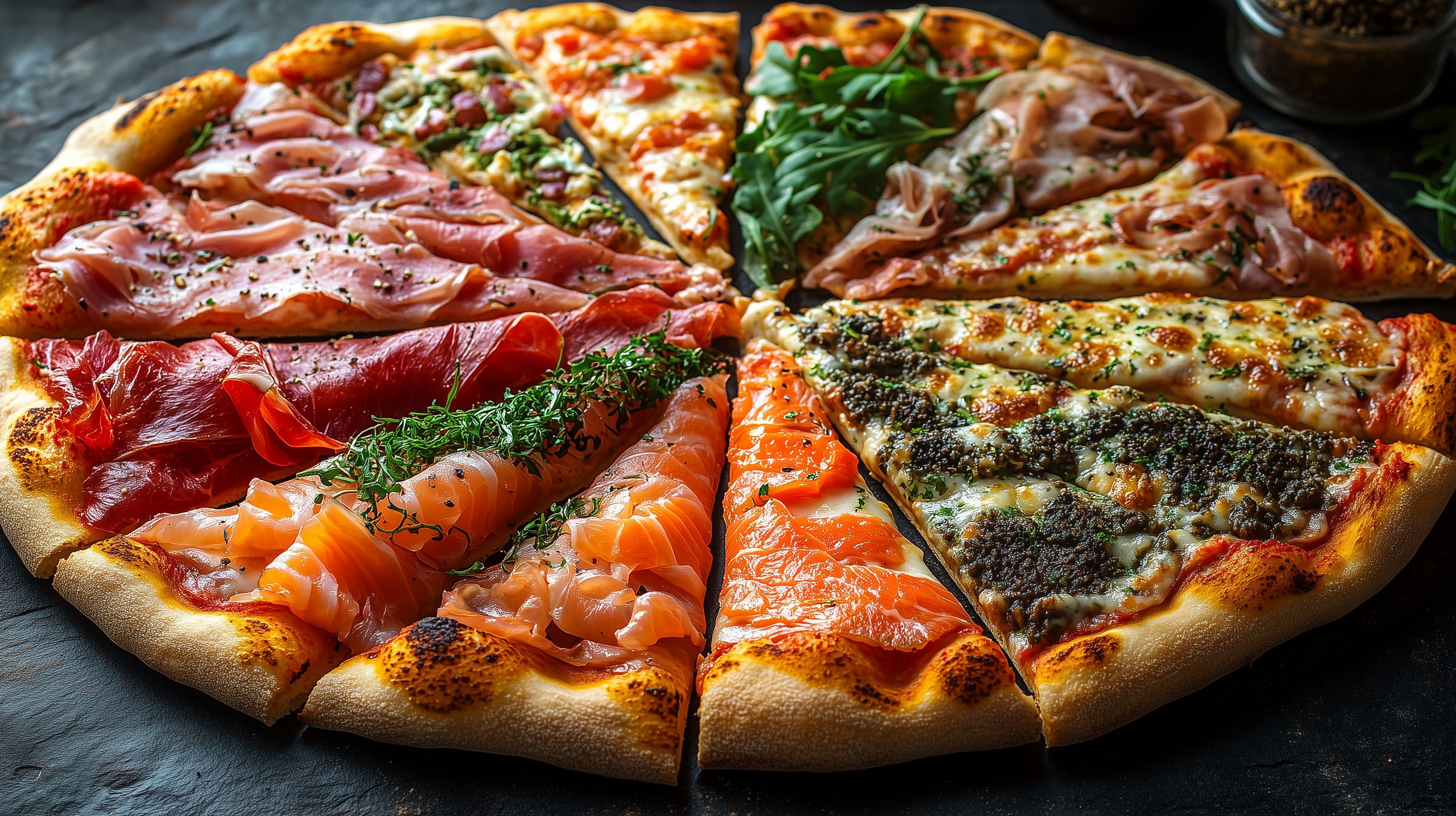 Dieses Foto zeigt eine appetitlich angerichtete Gourmetpizza mit einer Vielzahl an hochwertigen Belägen. Die Pizza ist aufgeschnitten und präsentiert in einer rustikalen Optik auf einem dunklen Untergrund. Zu sehen sind Zutaten wie Salami, Schinken, Lachs, Rucola, Oliven und Kräuter, die das Gericht abwechslungsreich und schmackhaft erscheinen lassen. Das Foto eignet sich hervorragend als kostenloses Stockfoto für die Verwendung in Blogbeiträgen, Werbekampagnen oder Social-Media-Postings rund um das Thema Lebensmittel, Kulinarik und gesunde Ernährung. Die hochauflösende Qualität und die Creative-Commons-Lizenz ermöglichen eine flexible und rechtssichere Nutzung.