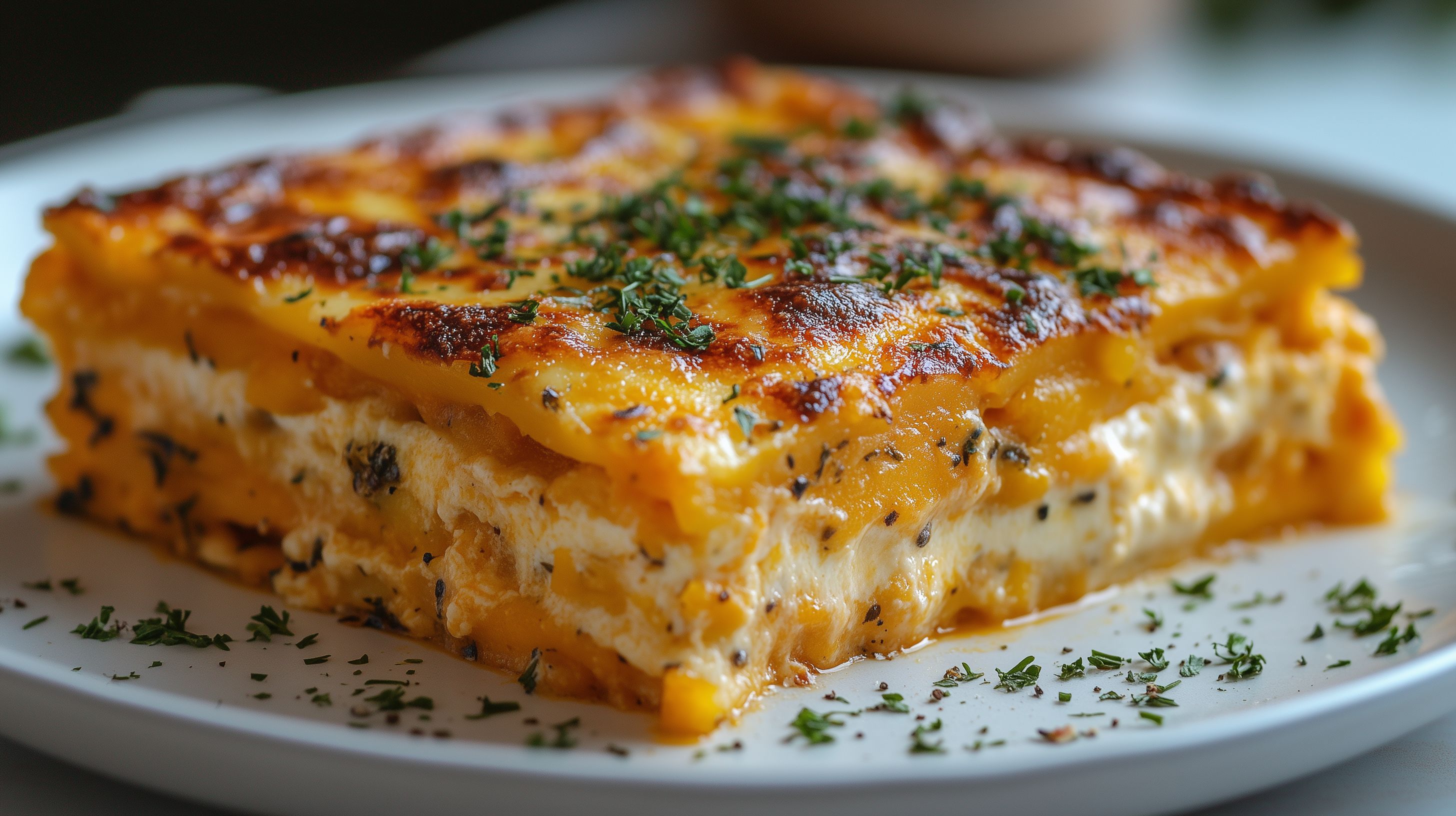 Dieses Foto zeigt eine köstliche Butternut-Kürbis-Lasagne mit einer goldenen, knusprigen Kruste. Das Gericht ist auf einem weißen Teller angerichtet und mit frischen Kräutern garniert. Die Lasagne sieht appetitlich und hausgemacht aus, mit Schichten von cremigem Kürbispüree und geschmolzenem Käse. Dieses hochwertige Stockfoto eignet sich hervorragend für Rezeptbeiträge, Kochblogs, Kochbücher oder Werbematerialien für gesunde, vegetarische Ernährung. Das Foto ist in hoher Auflösung verfügbar und unter einer Creative-Commons-Lizenz frei nutzbar.