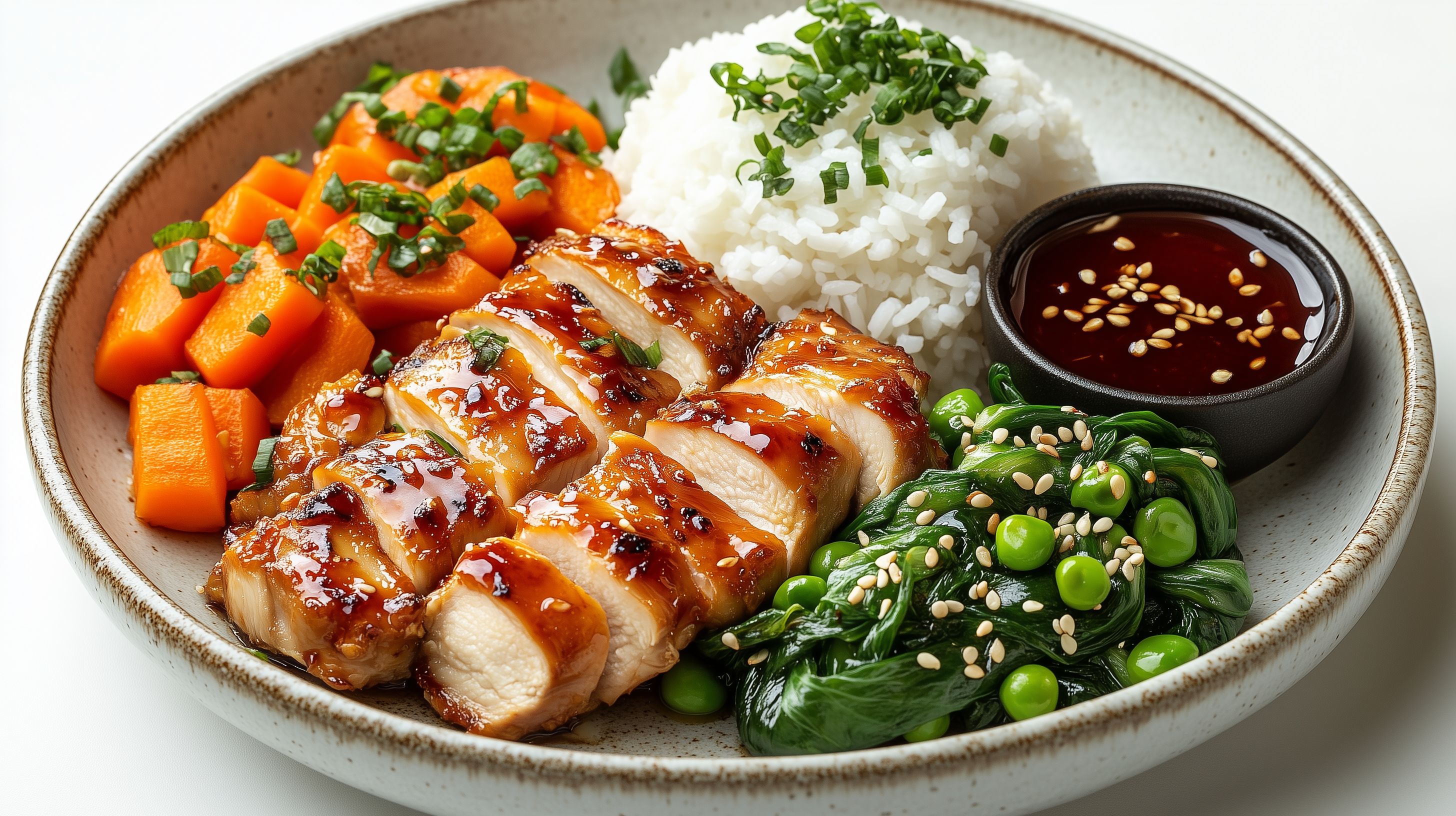 Dieses Foto zeigt ein leckeres und gesundes Teriyaki-Hähnchengericht, serviert in einer rustikalen Keramikschale. Auf dem Teller finden sich neben den goldbräunlich glänzenden Hähnchenstücken auch gedünsteter Reis, saftige Karotten und frisches, grünes Gemüse. Abgerundet wird das Gericht durch eine Schale Sojasauce und dekorative Sesamsamen. Die Anordnung der Zutaten in der Schale sowie die warmen Farbtöne und natürliche Beleuchtung verleihen dem Foto eine einladende, appetitliche Optik. Dieses Stockfoto in hoher Auflösung eignet sich perfekt für die Verwendung in Foodblogs, Kochportalen, Rezeptsammlungen oder Werbekampagnen rund um asiatische Küche und gesunde Ernährung. Es steht unter einer Creative-Commons-Lizenz zur freien Nutzung zur Verfügung.