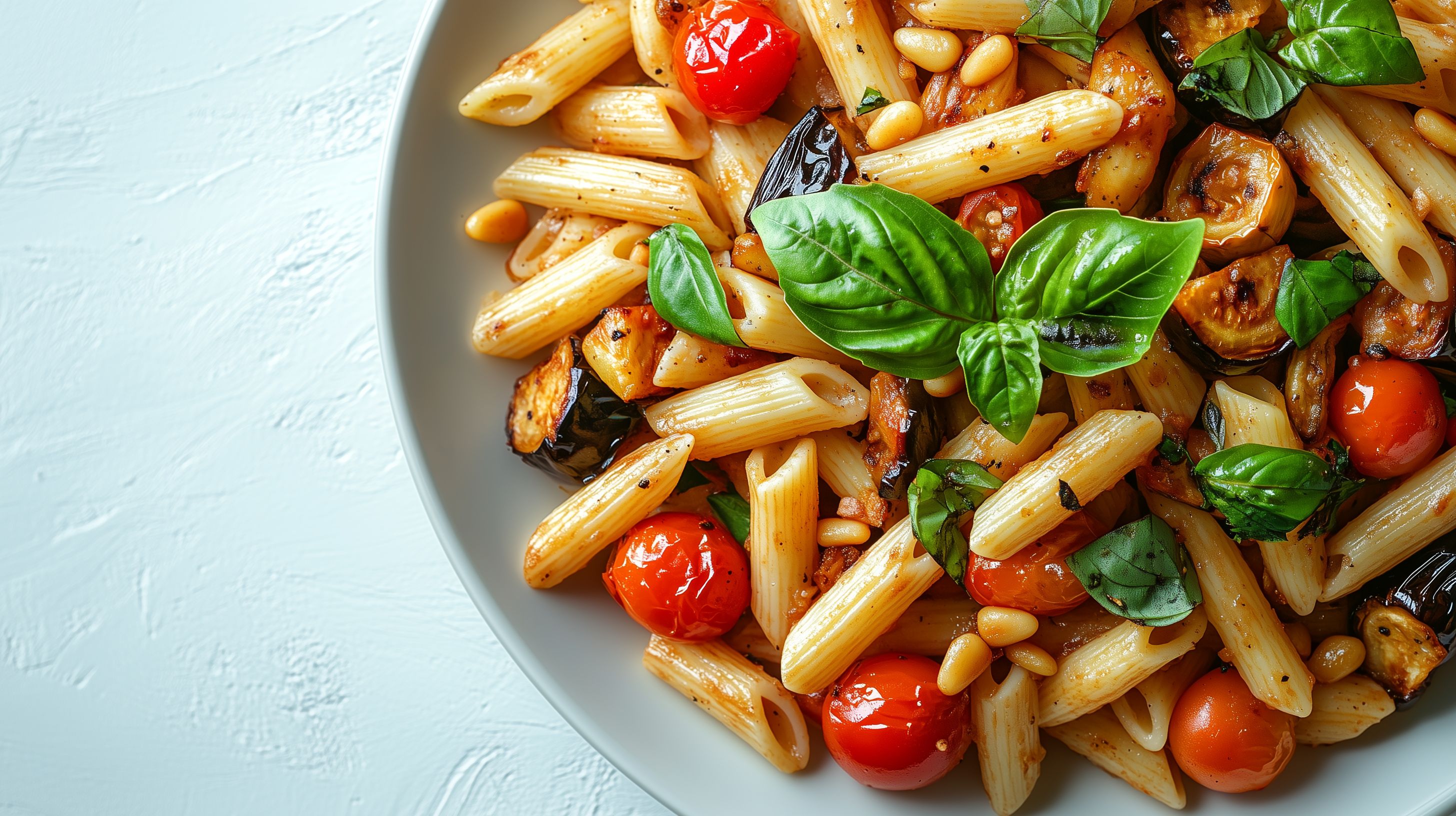 Dieses appetitliche Foto zeigt eine Schüssel mit bunter Pasta, frischen Tomaten, gerösteten Kichererbsen und grünen Basilikumblättern. Die Komposition ist rustikal und natürlich, mit lebendigen Farben und einem ausgewogenen Arrangement der Zutaten. Dieses köstliche Gericht eignet sich hervorragend als Hauptspeise oder Beilage, beispielsweise für einen Blogbeitrag über gesunde Mittelmeerküche, einen Newsletter zum Thema saisonale Ernährung oder als hochwertiges Stockfoto für Social-Media-Posts zur Lebensmittelfotografie. Das hochauflösende Bild steht unter einer Creative-Commons-Lizenz zur freien Verwendung zur Verfügung.