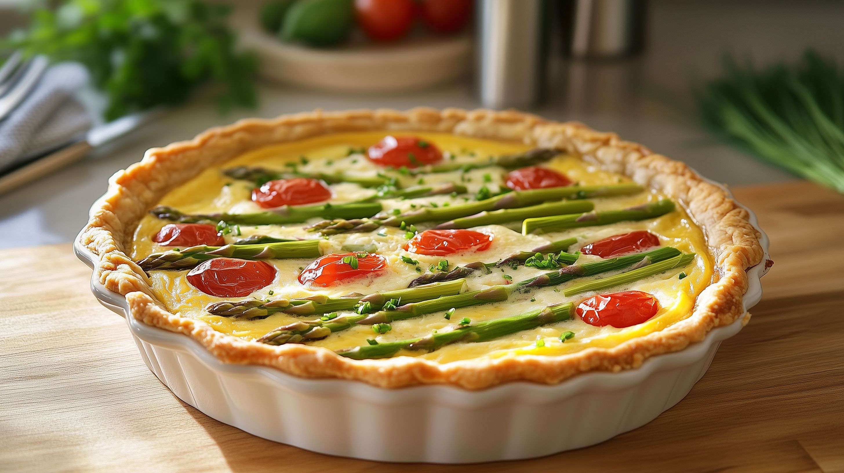 Dieses köstliche Bild zeigt eine leckere Gemüsetarte, die mit frischen Zutaten wie Spargel, Tomaten und einer cremigen Füllung zubereitet wurde. Die dekorative Anordnung der Zutaten auf dem fluffigen Teigboden verleiht dem Gericht eine besonders appetitliche Optik. Die Farbkombination aus dem satten Gelb der Füllung, dem Grün des Spargels und dem Rot der Tomaten schafft einen harmonischen, natürlichen Look. Dieses hochwertige Stockfoto eignet sich hervorragend für den Einsatz in Blogs, Newslettern, Werbekampagnen oder auf Social-Media-Kanälen zum Thema Kochen, Ernährung und gesunde Küche. Das Foto ist in hoher Auflösung verfügbar und steht unter einer Creative-Commons-Lizenz zur Verfügung.