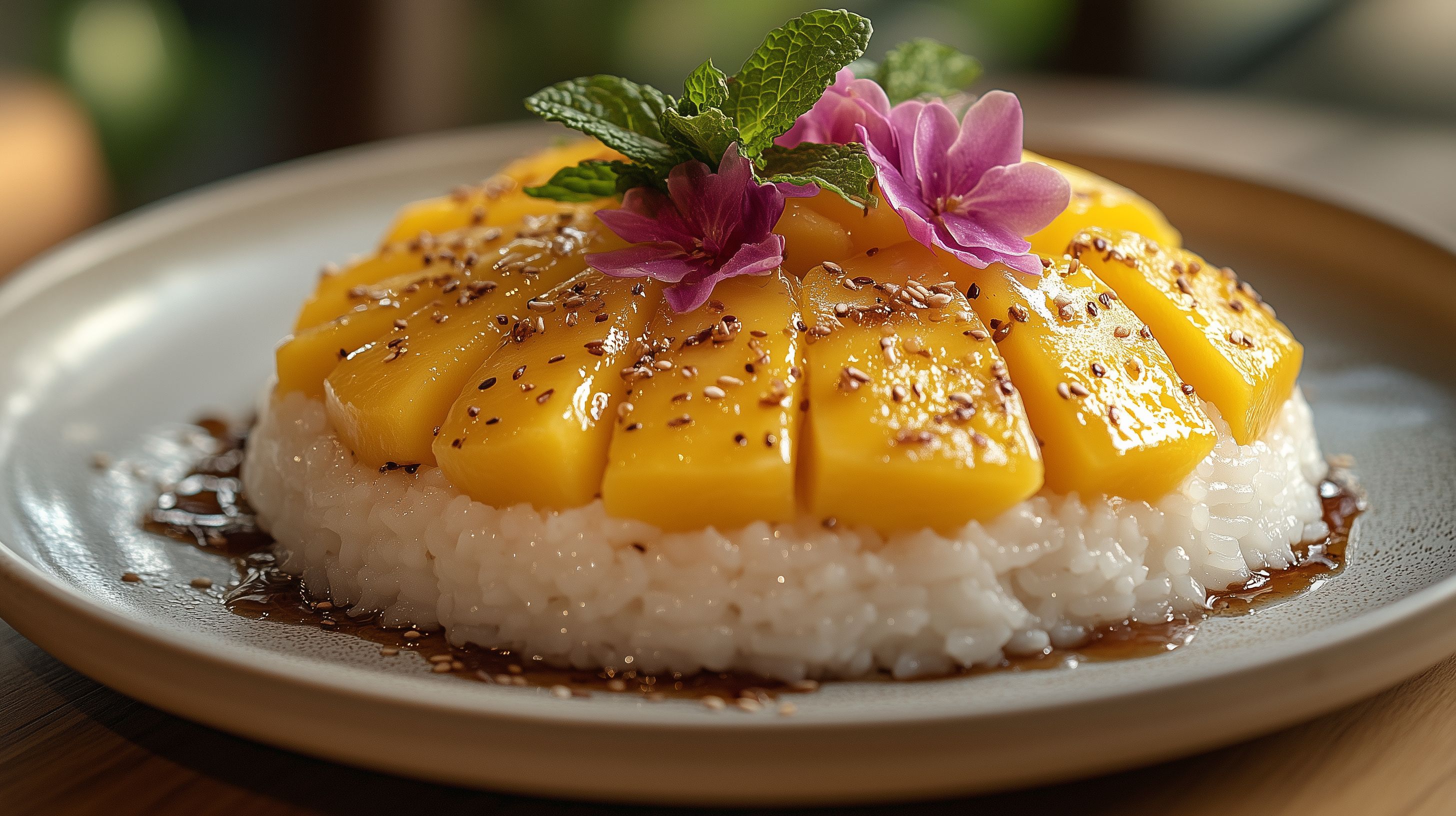 Dieses farbenfrohe Foto zeigt eine leckere Reisspeise mit geschnittenen, leuchtend orangefarbenen Mangostücken, dekoriert mit rosa Blüten und frischen Minzblättern. Der Reis ist mit brauner Soße übergossen und mit Sesamsamen bestreut, was ihm ein appetitliches Aussehen verleiht. Das Gericht wird auf einem hellen Teller präsentiert und bietet eine perfekte Kombination aus süß, würzig und exotisch. Diese hochauflösende Aufnahme eignet sich ideal als kostenloses Stockfoto für Blogs, Websites oder Social-Media-Beiträge, die eine natürliche, kulinarische Ästhetik vermitteln wollen.
