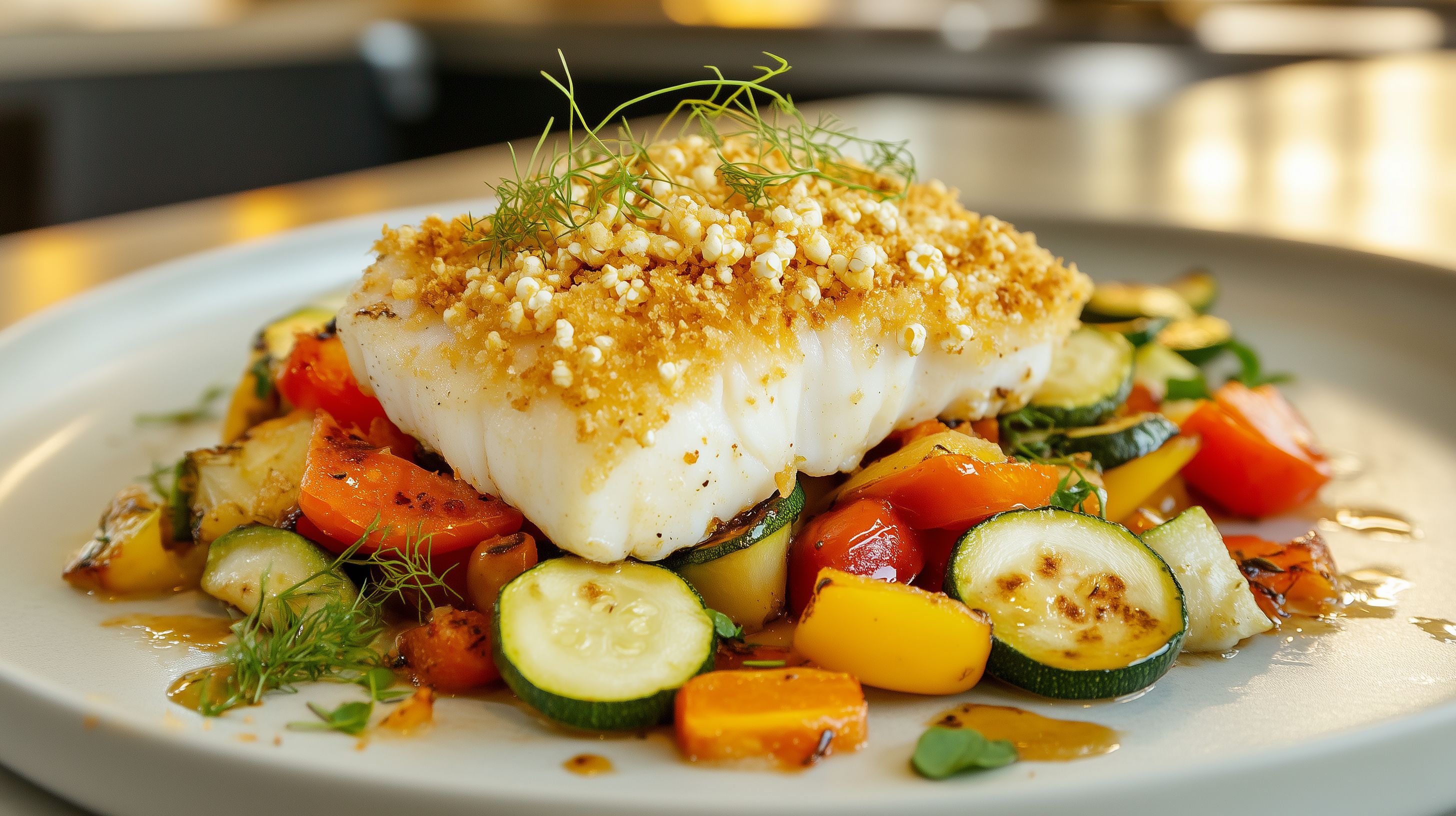 Das Foto zeigt ein köstliches Kabeljau-Gericht mit einer knusprigen Kruste, serviert auf einem Teller mit frisch gegrilltem Gemüse wie Zucchini, Paprika und Tomaten. Die Komposition ist sehr appetitlich und lässt den Betrachter direkt den Geruch und Geschmack dieser leckeren Mahlzeit erahnen. Das Foto eignet sich hervorragend für den Einsatz in Blogs, Newslettern, Social-Media-Beiträgen oder Werbematerialien rund um gesunde Ernährung, mediterrane Küche oder die Präsentation von Fischgerichten in hoher Qualität. Als kostenloses Stockfoto in hoher Auflösung und unter einer Creative-Commons-Lizenz können Kreative dieses Bild vielfältig und ohne Einschränkungen nutzen.