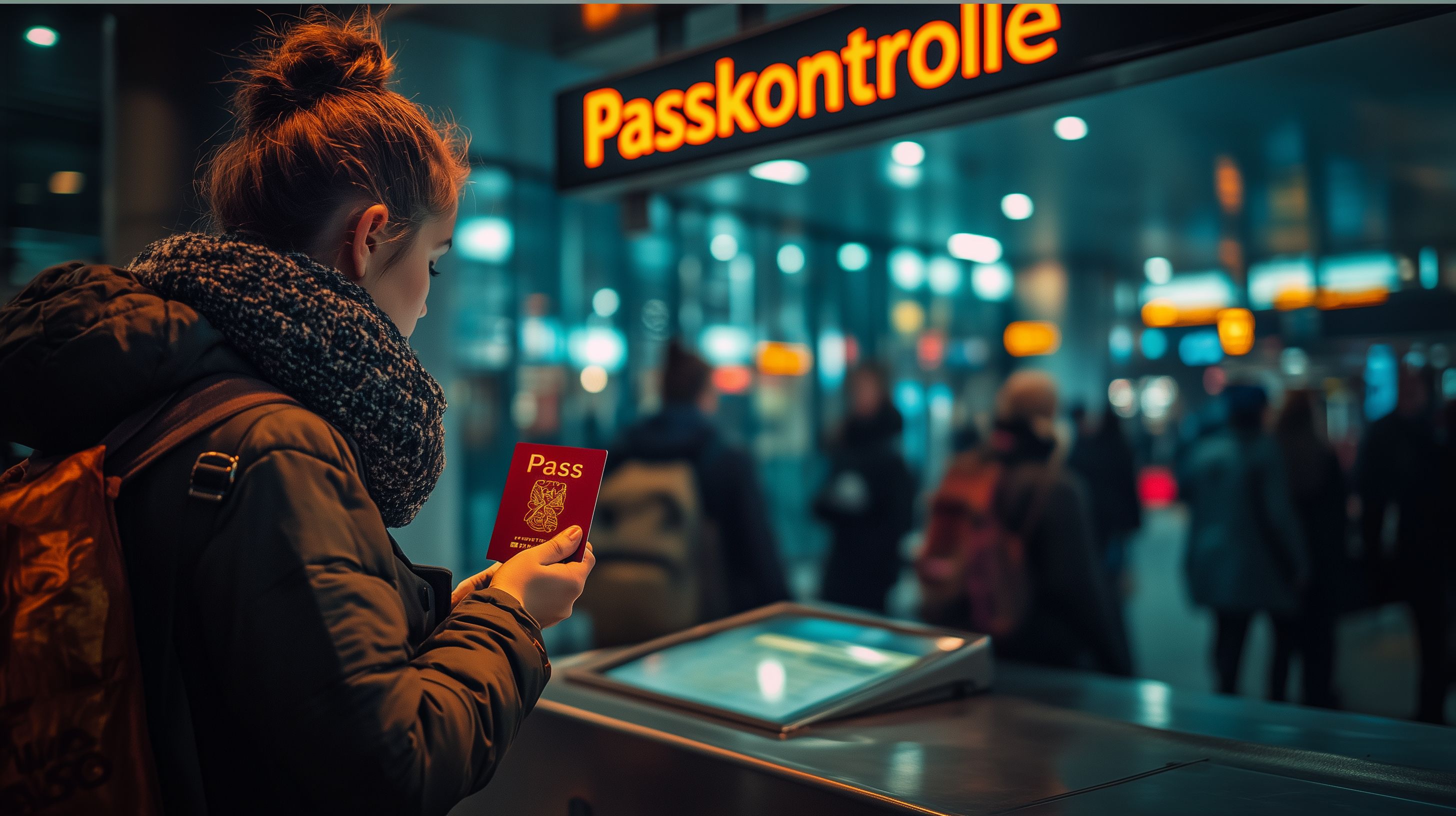 Das Foto zeigt eine Szene an einem Flughafen-Passkontrollschalter. Im Vordergrund ist eine Person zu sehen, die ihren Reisepass in der Hand hält. Im Hintergrund ist der beleuchtete Schriftzug 'Passkontrolle' zu erkennen, und weitere Reisende stehen in einer Warteschlange. Die farbige, beleuchtete Umgebung erzeugt eine dynamische, leicht hektische Stimmung, die typisch für einen Flughafen ist. Dieses Bild könnte hervorragend für Reise-Blogbeiträge, Newsletter oder Social-Media-Posts zu Themen wie Flugverkehr, Tourismus oder Lifestyle verwendet werden. Es ist ein kostenloses Stockfoto in hoher Auflösung, das unter einer Creative-Commons-Lizenz veröffentlicht wurde.