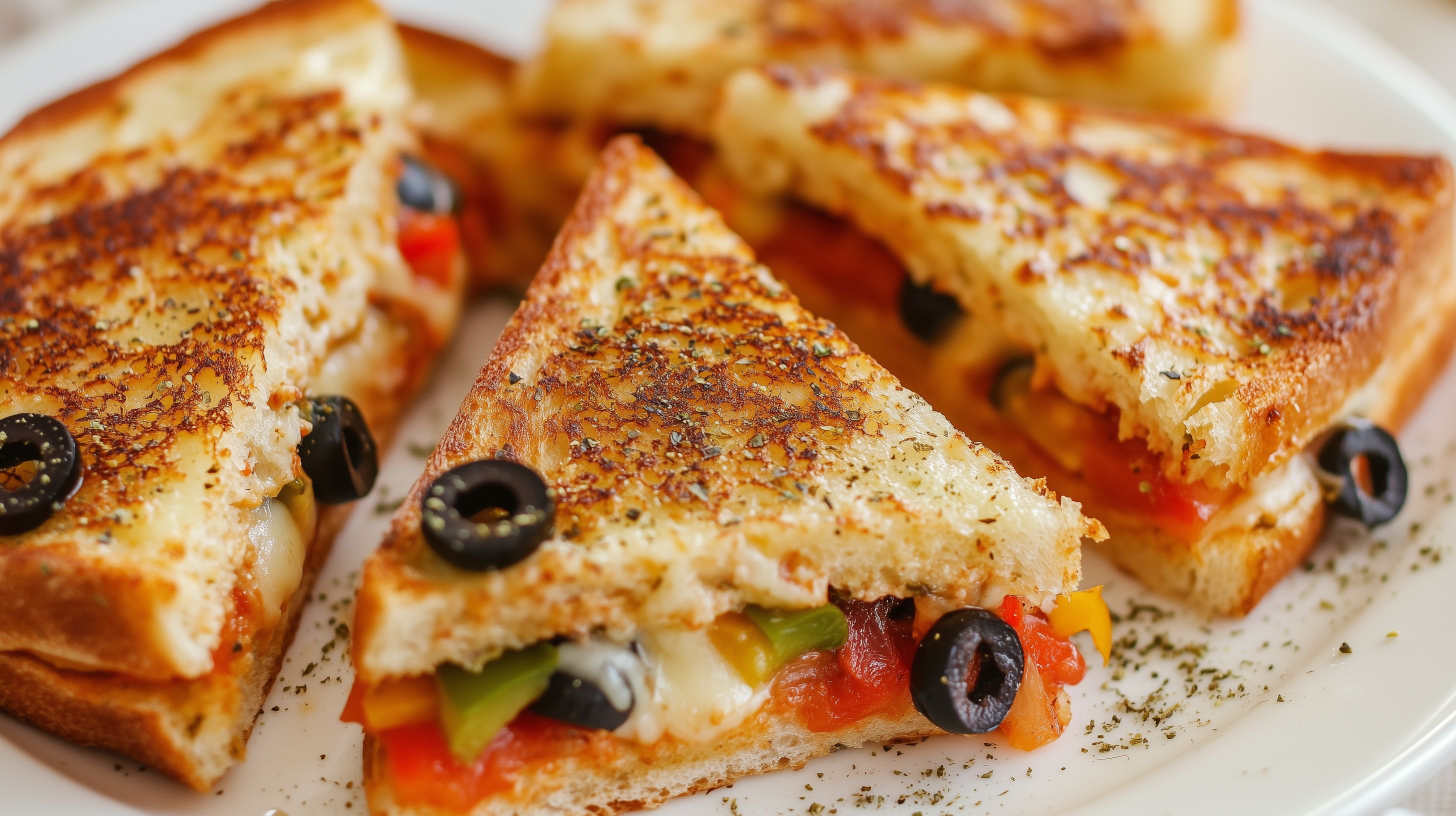 Dieses leckere mediterrane Pizza-Sandwich ist ein appetitlicher Blickfang. Die knusprige, goldbraune Oberfläche lädt förmlich zum Reinbeißen ein. In der Füllung finden sich bunte Paprikastücke, schwarze Oliven und weitere würzige Zutaten, die einen köstlichen Genuss versprechen. Das Foto ist ideal als vielseitiges Stockfoto für Lebensmittel- und Kochblogs, Newsletter, Social-Media-Kanäle oder Werbematerial. Es liegt in hoher Auflösung und unter Creative-Commons-Lizenz vor, sodass es frei genutzt werden kann.