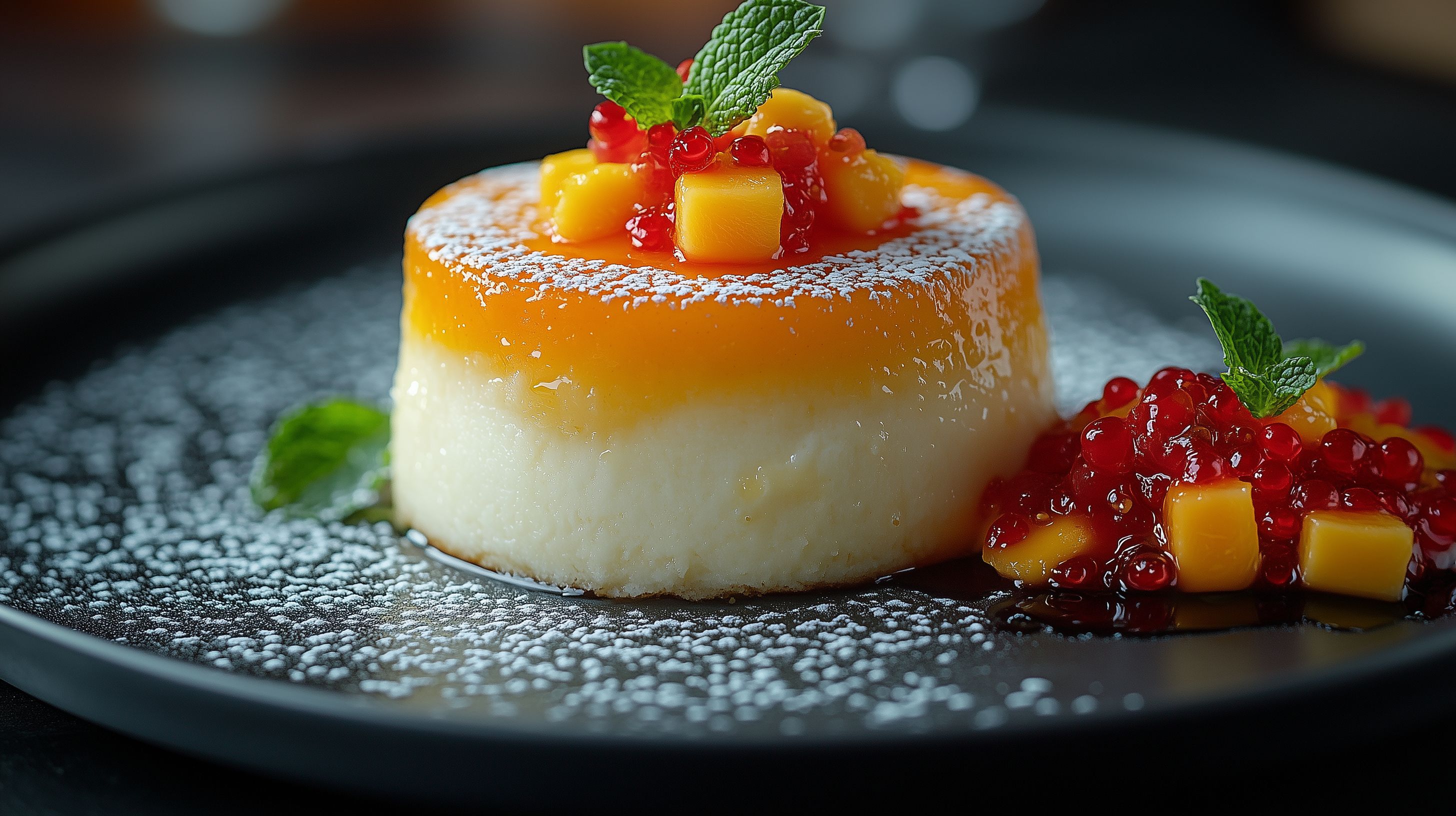 Das Bild zeigt ein elegantes Kokos-Dessert mit tropischen Früchten wie Ananas und Granatapfel als Topping. Das Parfait ist in einer runden Form serviert und mit Puderzucker bestäubt, was dem Gericht eine luftige, leichte Optik verleiht. Garniert ist das Dessert mit frischer Minze, die einen schönen Kontrast zu den saftigen Früchten bildet. Die warmen Farbtöne und die aufwendige Präsentation machen dieses Kokos-Parfait zu einem verlockenden Blickfang für Dessertkarten, Kochbücher oder Lebensmittelfotos. Dieses hochwertige, kostenlose Stockfoto in hoher Auflösung kann unter einer Creative-Commons-Lizenz genutzt werden.