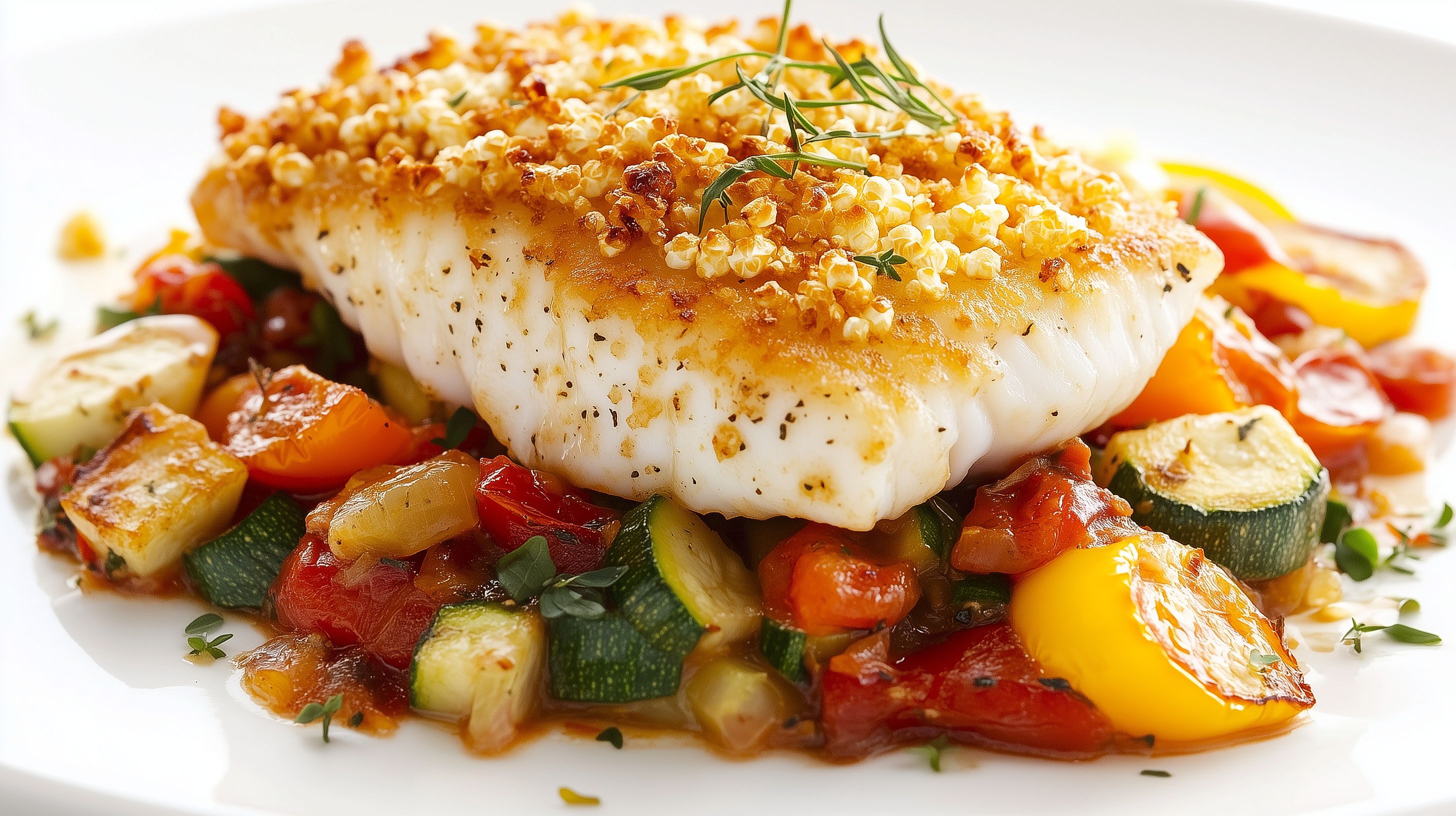 Das Bild zeigt ein knuspriges Kabeljau-Filet, das mit einer goldbraunen Quinoa-Kruste überbacken ist und auf einem Bett von frisch gegrilltem Gemüse wie Paprika, Zucchini und Tomaten platziert ist. Die Anordnung wirkt natürlich und rustikal, die Farben sind warm und appetitlich. Dieses Foto eignet sich hervorragend für Rezeptblogs, Kochbücher, Gesundheitsportale oder auch Werbung für gesunde Ernährung. Es ist in hoher Auflösung verfügbar und unter einer Creative-Commons-Lizenz frei nutzbar.