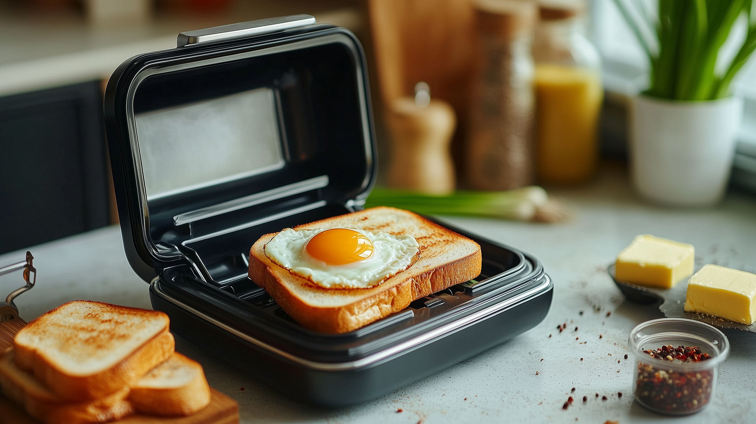 Das Foto zeigt ein leckeres Frühstückssandwich, das gerade in einem modernen, schwarzen Sandwich-Maker zubereitet wird. Im Vordergrund ist ein getoastetes Brotscheibe mit einem frisch gekochten Spiegelei zu sehen. Weitere Elemente im Bild sind Gewürze, wie Pfeffer, und ein Glas Orangensaft, die auf einem hellen, natürlich beleuchteten Holztisch platziert sind. Die klaren, warmen Farben und die reduzierte, minimalistische Komposition verleihen dem Foto eine ruhige, ästhetische Anmutung.