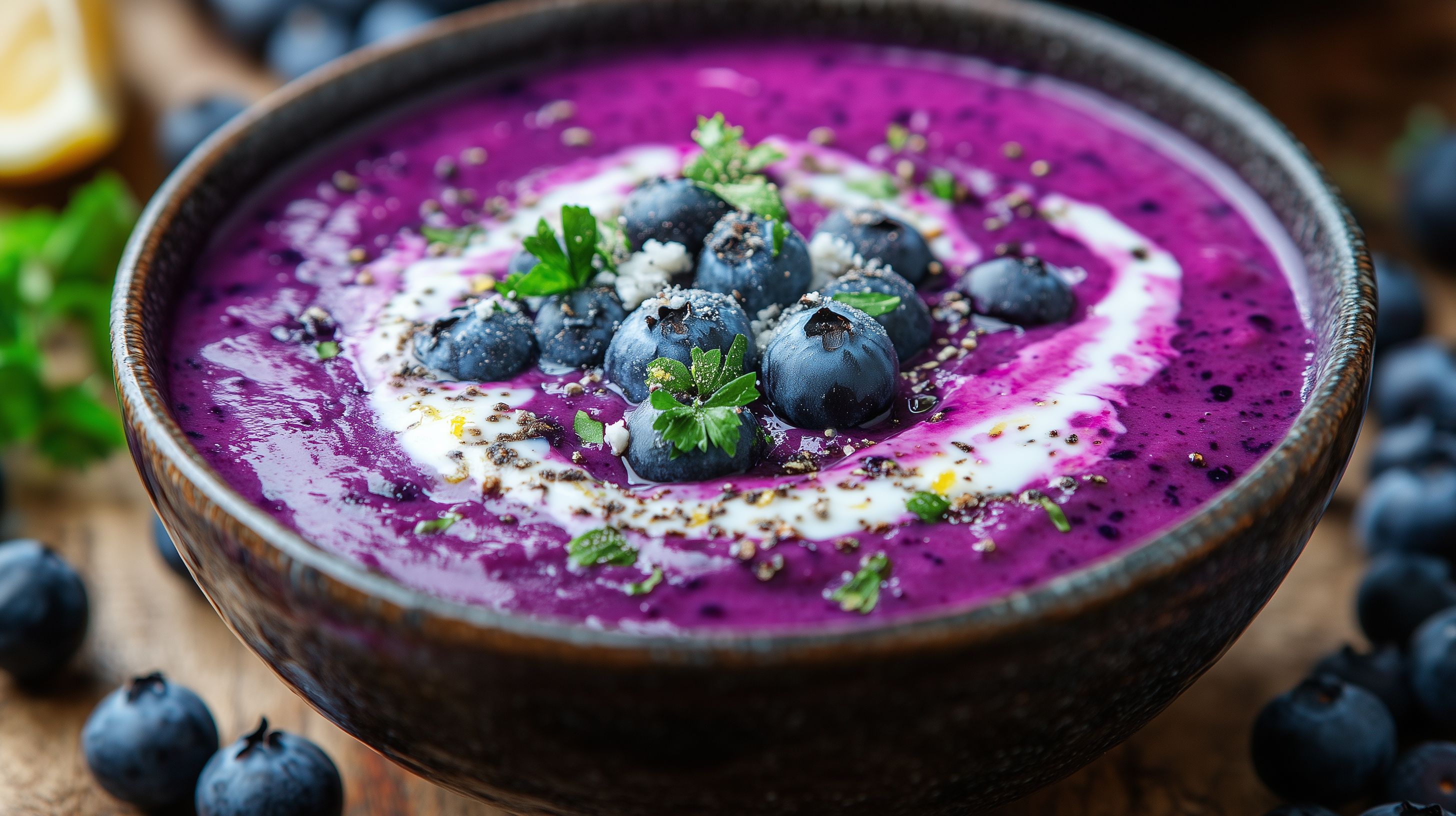 Dieses köstliche Foto zeigt eine leckere, cremige Blaubeersuppe in einer rustikalen Holzschale. Die intensive, dunkelviolette Farbe der Suppe und die frisch gepflückten Blaubeeren, die als Topping dienen, verleihen dem Gericht einen appetitlichen und natürlichen Look. Das Foto besticht durch seine klare Komposition, die Schärfe der Details und die stimmungsvolle Beleuchtung. Diese Blaubeersuppe eignet sich hervorragend als Dessert, Smoothie oder sogar als Basis für weitere Gerichte wie Joghurt-Parfait. Das hochauflösende Foto in hoher Qualität ist ein kostenloses Stockfoto unter Creative-Commons-Lizenz und kann für vielfältige Anwendungen in Blogs, Newslettern oder Werbematerialien genutzt werden.