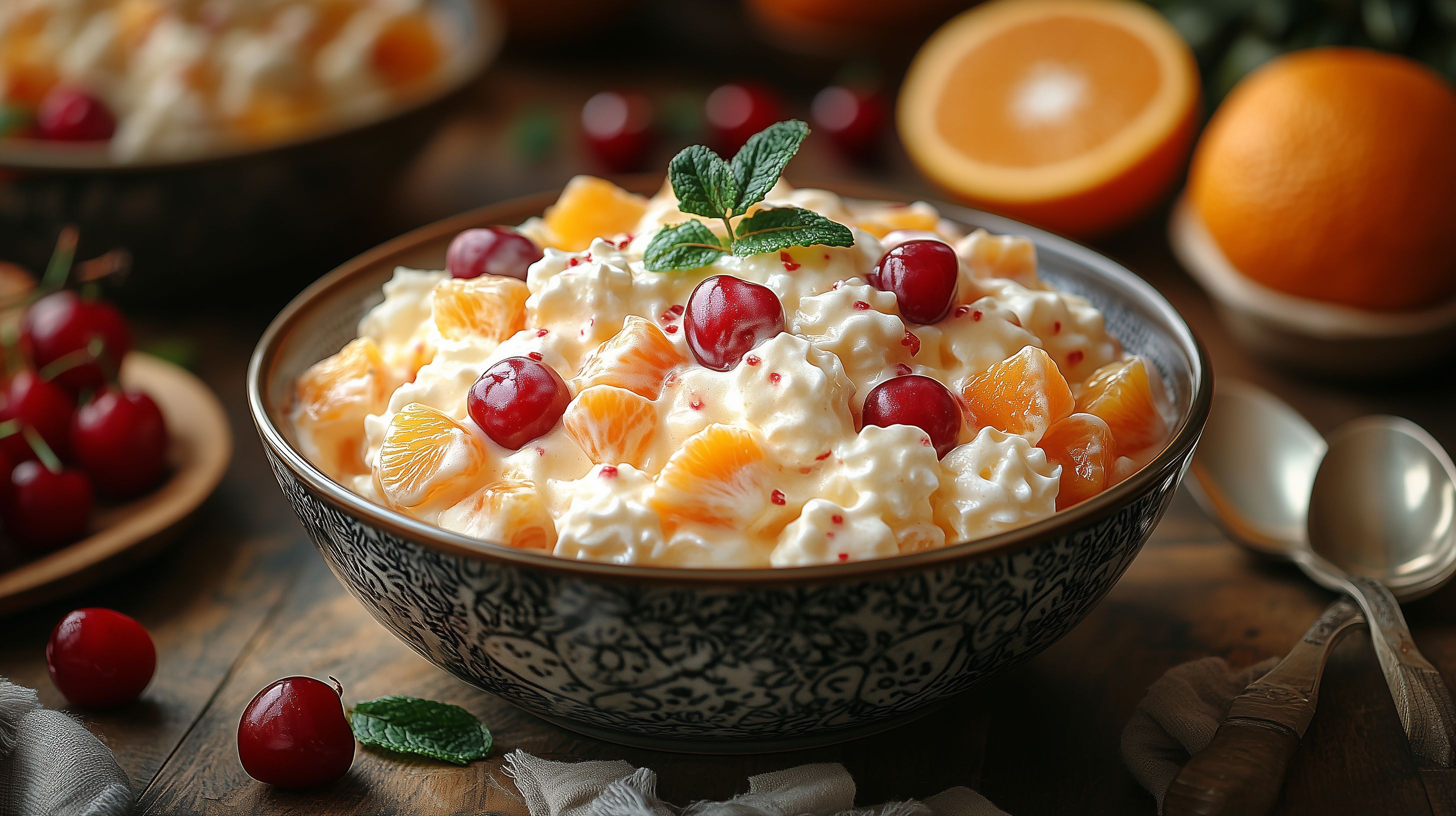 Das Bild zeigt ein cremiges Ambrosia-Dessert, das mit frischen Kirschen, Mandarinenscheiben und einer grünen Minzblatt-Dekoration serviert wird. Die Speise befindet sich in einer dunkel gemusterten Schüssel, die auf einem Holzbrett platziert ist, umgeben von weiteren Zutaten wie ganzen Kirschen. Die Farbpalette ist warm und einladend, mit den roten Kirschen, den orangenen Mandarinen und der cremefarben-weißen Dessertcreme. Das Foto vermittelt ein Gefühl von Üppigkeit und saisonaler Frische. Es eignet sich hervorragend als kostenloses Stockfoto für die Verwendung in Blogs, Newslettern, Social-Media-Posts oder Werbematerial mit dem Fokus auf gesunde, natürliche Ernährung oder kreative Foodfotografie in hoher Auflösung und unter einer Creative-Commons-Lizenz.