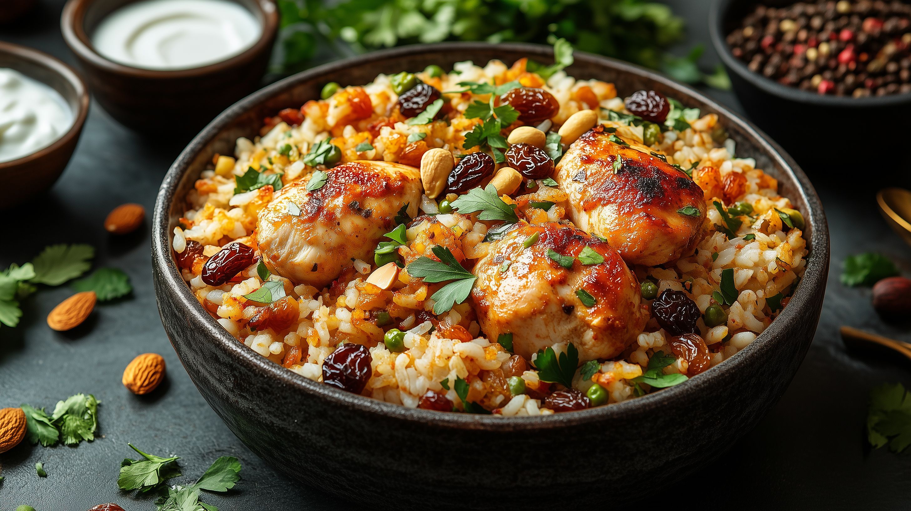 Dieses Foto zeigt ein leckeres orientalisches Reisgericht mit Hähnchen, Rosinen und Mandeln. Das Gericht ist in einer rustikalen Holzschale angerichtet und mit frischen Kräutern garniert, was ihm ein appetitliches Aussehen verleiht. Das Foto eignet sich hervorragend als kostenloses Stockfoto für Rezeptsammlungen, Kochblogs, Restaurantwebsites oder kulinarische Social-Media-Kanäle. Das hochwertige Bild in hoher Auflösung steht unter einer Creative-Commons-Lizenz zur Verfügung.