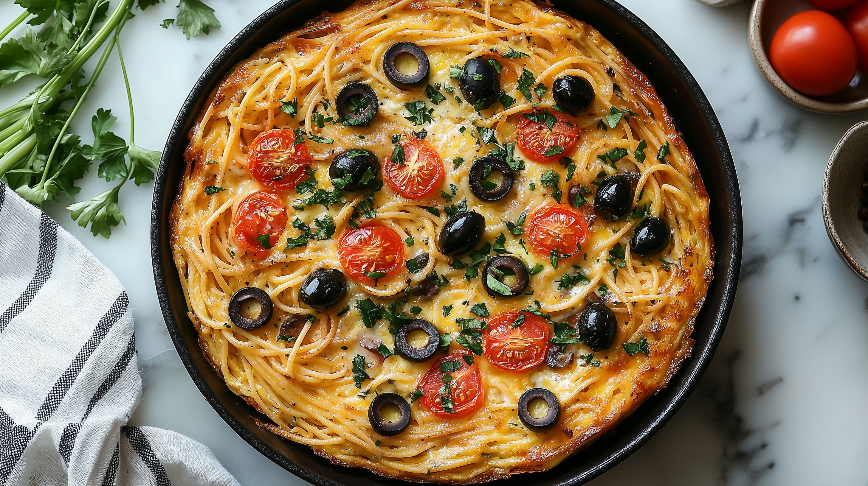 Dieses verlockende Foto zeigt eine köstliche Frittata, eine italienische Omelett-Torte, die mit bunten Tomaten, schwarzen Oliven und frischen Kräutern garniert ist. Die Pasta-Frittata ist in einer rustikalen Pfanne angerichtet und wird von grünen Kräuterzweigen sowie Tomaten und Oliven umrahmt. Das Gericht strahlt eine warme, mediterrane Atmosphäre aus und lässt förmlich das Wasser im Mund zusammenlaufen. Es ist ein ideales kostenloses Stockfoto in hoher Auflösung für die Verwendung in Blogs, Newslettern, Social-Media-Beiträgen oder Werbekampagnen rund um italienische Küche, gesunde Ernährung und leckere Rezepte. Das Bild ist unter Creative-Commons-Lizenz frei nutzbar.