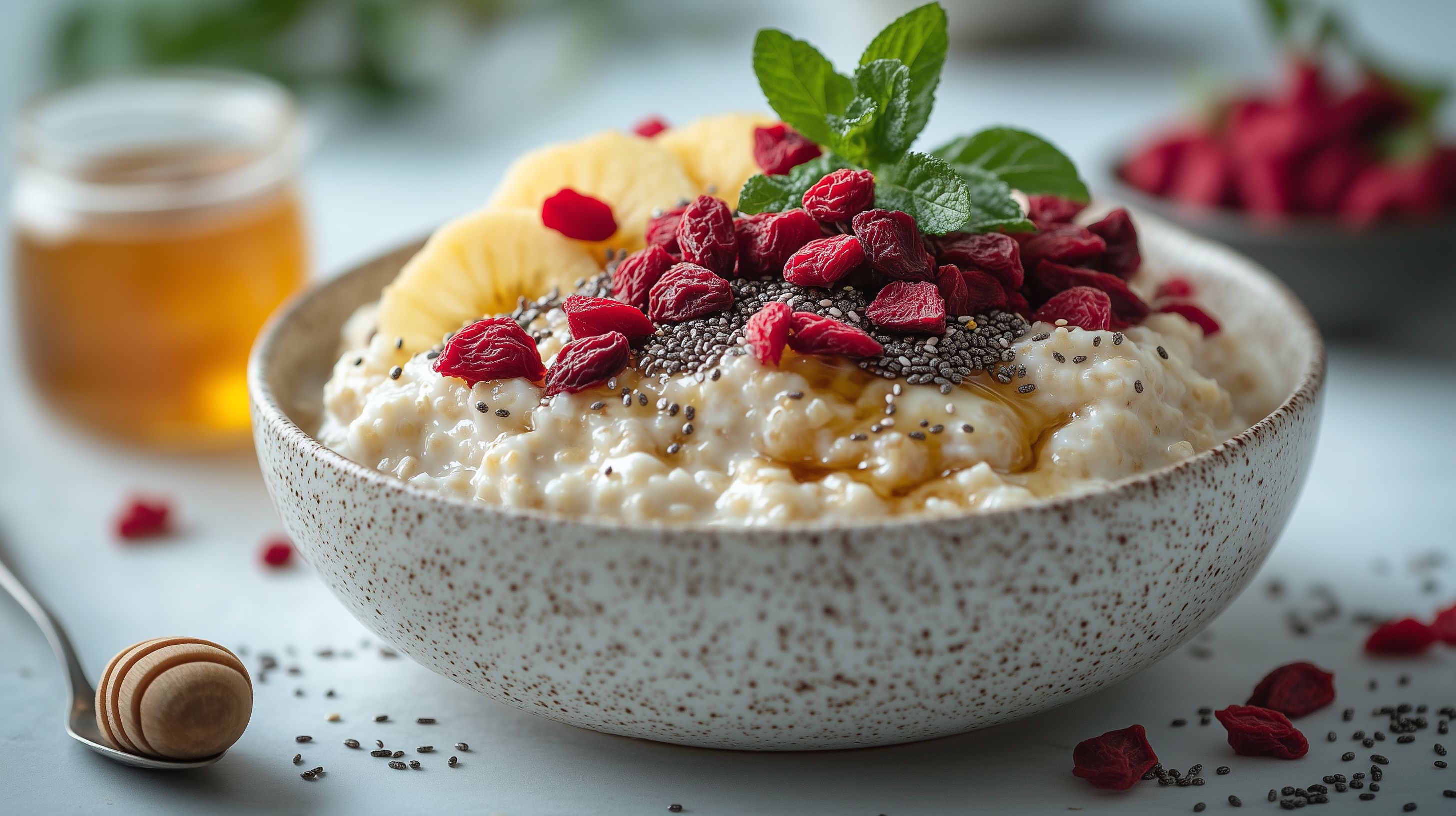 Dieses Foto zeigt einen leckeren und gesunden Haferbrei, der mit verschiedenen Superfoods wie Chia-Samen, Goji-Beeren und Banane verfeinert wurde. Die cremige Konsistenz des Haferbreis wird durch das Topping aus den frischen Zutaten wunderbar ergänzt. Das Bild bietet eine einladende und appetitliche Darstellung eines nährstoffreichen Frühstücks oder Brunch-Gerichts, das sich ideal für die Verwendung in Blogs, Newslettern, auf Social-Media-Kanälen oder in Werbekampagnen eignet. Als hochwertiges, kostenloses Stockfoto in Creative-Commons-Lizenz ist es für verschiedenste Einsatzzwecke geeignet.