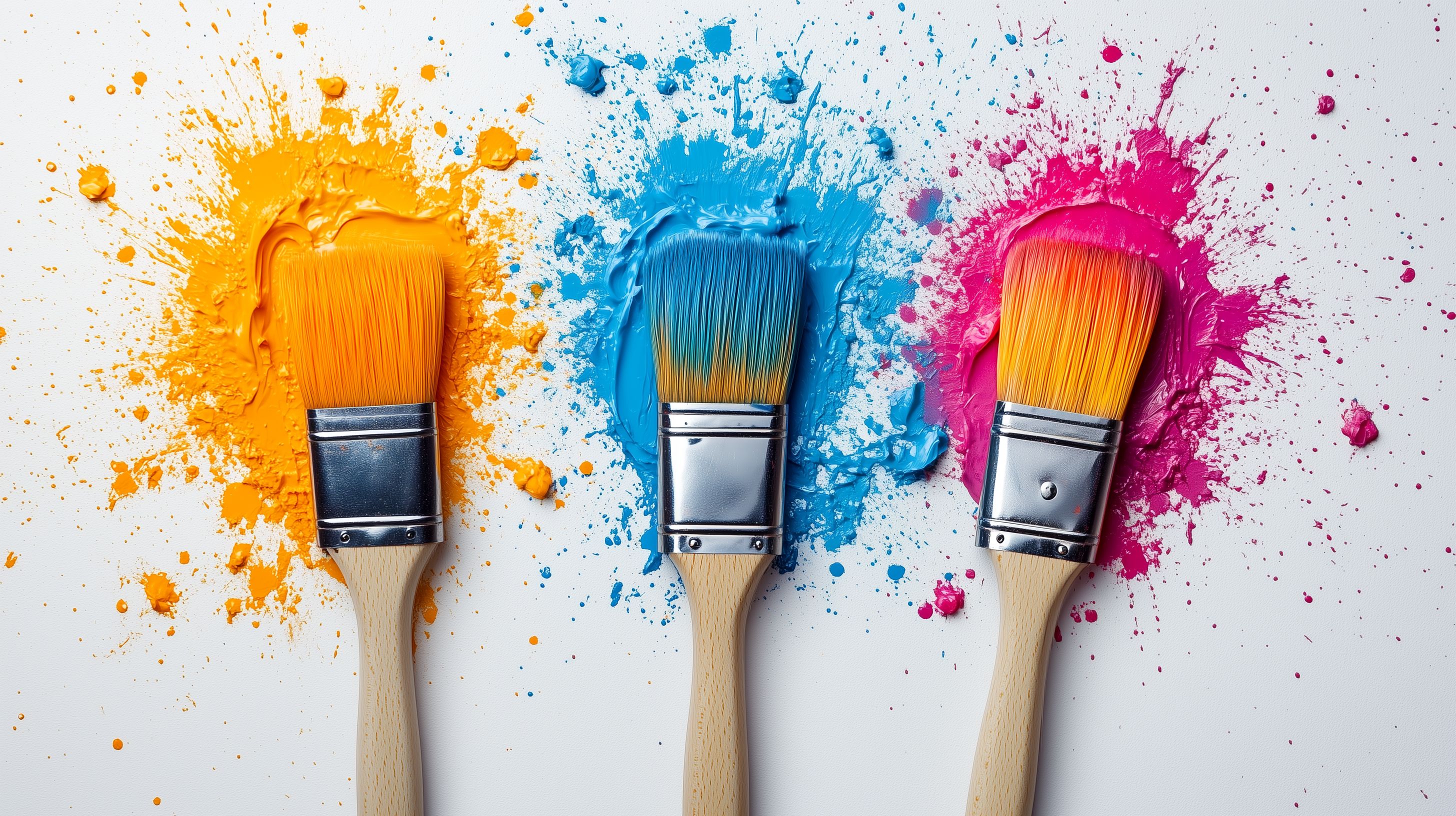Das Bild zeigt drei Pinsel, die farbige Spritzer auf einem weißen Hintergrund hinterlassen haben. Die Pinsel sind in den leuchtenden Farben Gelb, Blau und Pink getaucht, was eine lebendige und kreative Stimmung vermittelt. Die Komposition ist symmetrisch und zentriert, was den Fokus auf die Farbexplosion lenkt. Dieses Stockfoto eignet sich hervorragend für den Einsatz in Werbung, auf Blogs, in Newslettern oder in sozialen Medien, wo es eine inspirierende und kunstvolle Stimmung schaffen kann. Das Bild ist in hoher Auflösung verfügbar und steht unter einer Creative-Commons-Lizenz zur Verfügung.