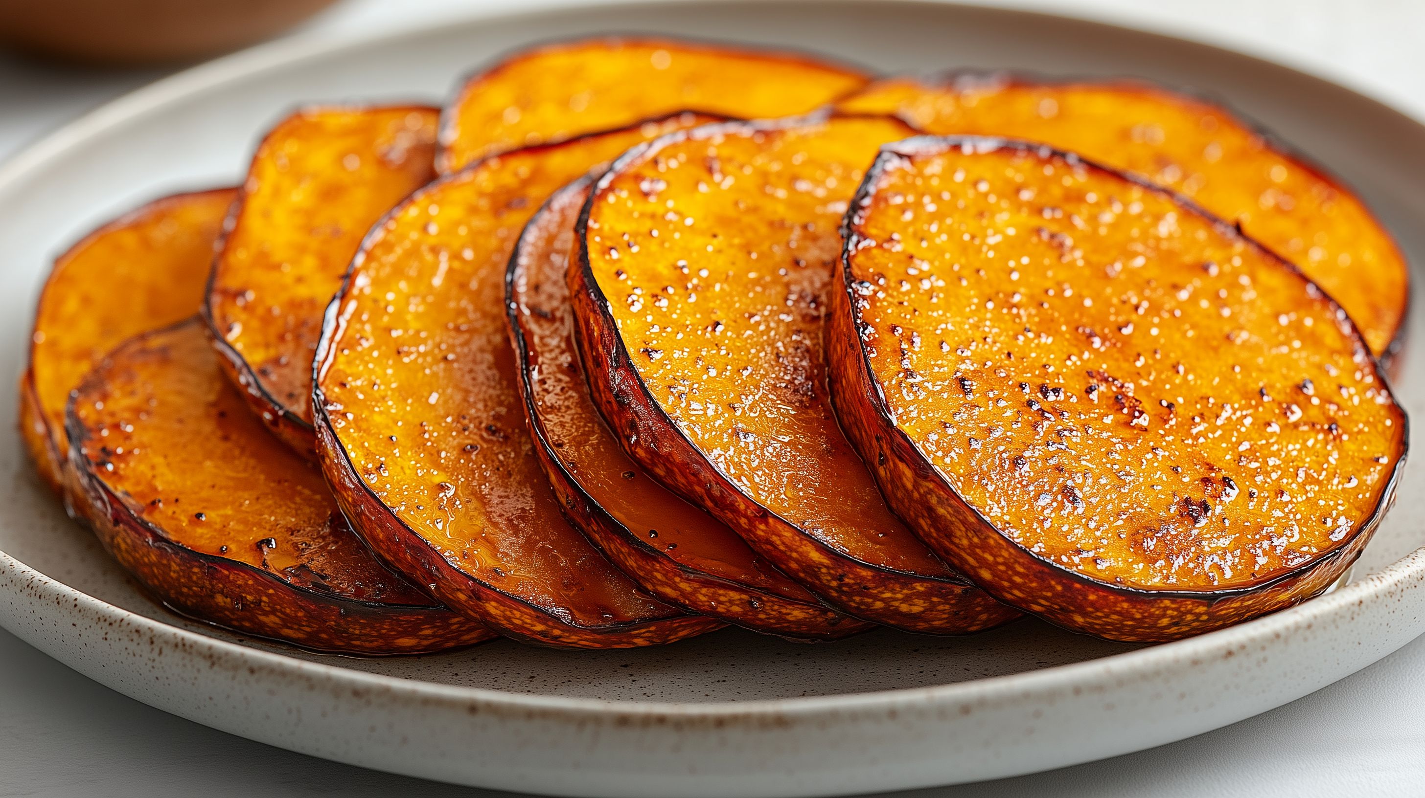 Dieses Foto zeigt eine Nahaufnahme von knusprig kandierten Scheiben von Süßkartoffeln auf einem hellen Teller. Die Kartoffelscheiben haben eine goldbraune, karamellisierte Oberfläche, die dem Gericht einen appetitlichen, rustikalen Charakter verleiht. Die Anordnung und Präsentation der Süßkartoffeln macht dieses Bild zu einem perfekten Motiv für Food-Fotografie, Kochbücher, Blogs oder Werbung rund um saisonales, gesundes und leckeres Essen. Dieses hochauflösende Stockfoto kann unter einer kostenlosen Creative-Commons-Lizenz genutzt werden.