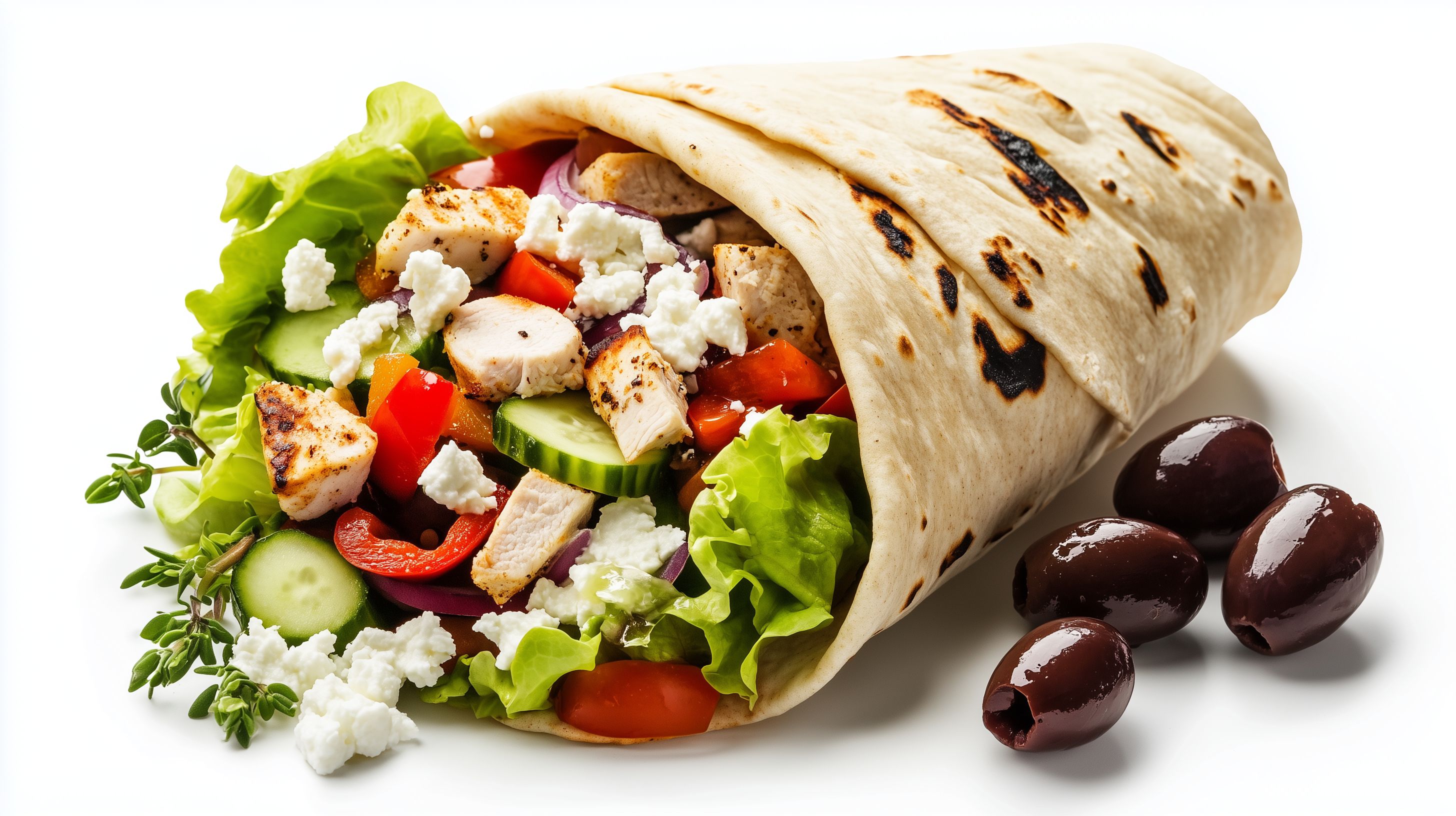 Das Foto zeigt eine appetitlich gefüllte Pita-Tasche mit gegrilltem Hähnchenfleisch, frischem Gemüse wie Tomaten, Gurken und Salat sowie krümeligen Feta-Käse und knackigen Oliven. Die Zutaten sind in einer rustikalen Art und Weise angerichtet und vor einem weißen Hintergrund fotografiert, was den Fokus ganz auf das leckere Gericht lenkt. Dieses Stockfoto eignet sich ideal für Blogs, Social-Media-Beiträge oder Werbematerialien rund um gesunde Ernährung, mediterrane Küche oder Gastronomie-Themen. Das hochauflösende Bild steht unter einer Creative-Commons-Lizenz kostenfrei zur Verfügung.
