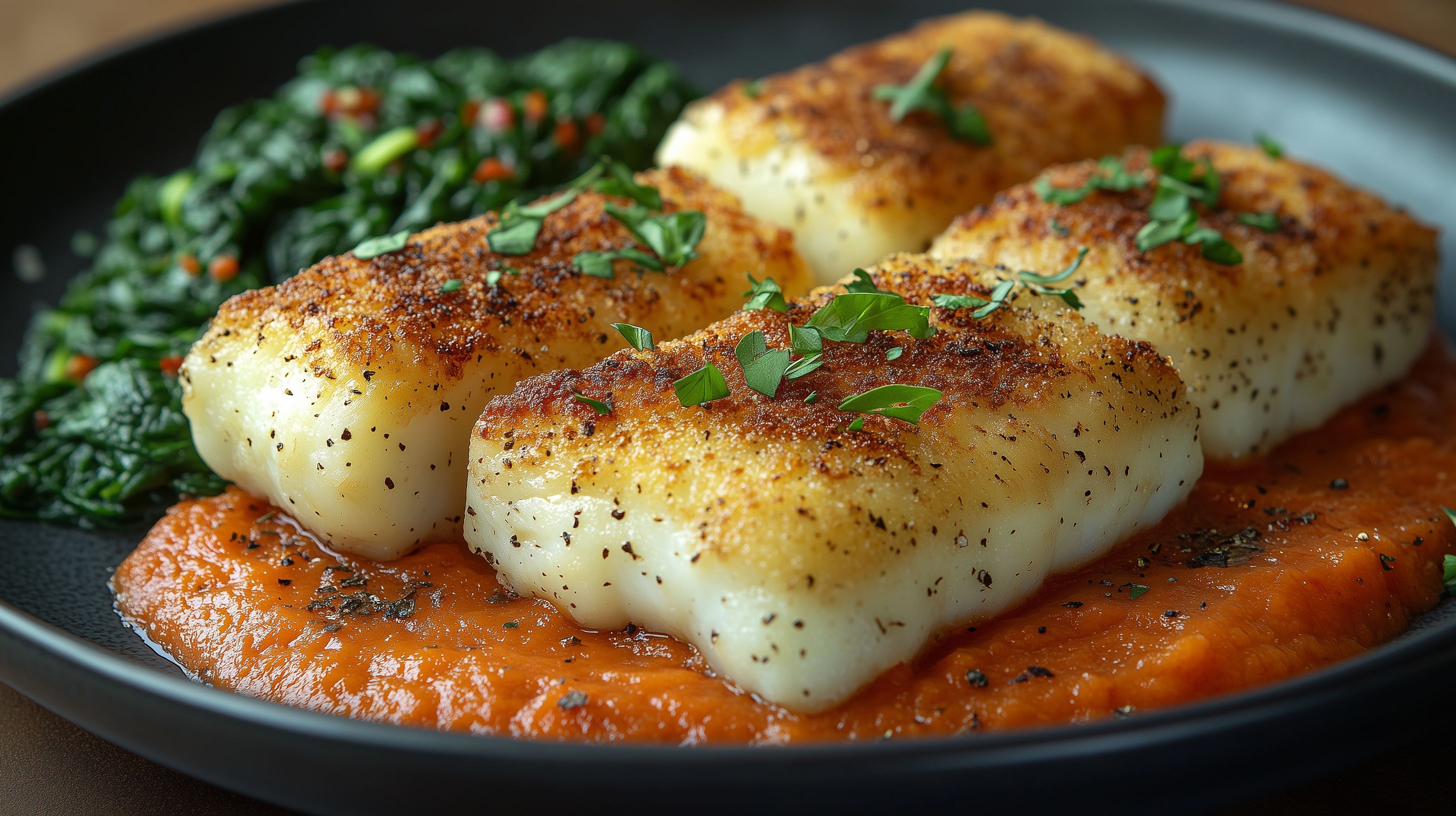 Das Bild zeigt ein köstliches Gericht aus zart gebratenen Seeteufel-Filets, die auf einem Bett von cremigem Spinat und einer leckeren Tomatensauce angerichtet sind. Die Filets sind mit feinen Gewürzen bestreut und verleihen dem Gericht einen appetitlichen Geschmack. Die rustikale Präsentation in einer dunklen Schüssel verleiht dem Gericht einen stilvollen, aber dennoch natürlichen Auftritt. Dieses Foto eignet sich hervorragend als kostenloses Stockfoto für den Einsatz in Blogs, Newslettern, Social-Media-Beiträgen oder Werbematerialien rund um das Thema Kulinarik, Fisch und gesunde Ernährung. Die hohe Bildqualität und Creative-Commons-Lizenz ermöglichen eine vielseitige Nutzung.