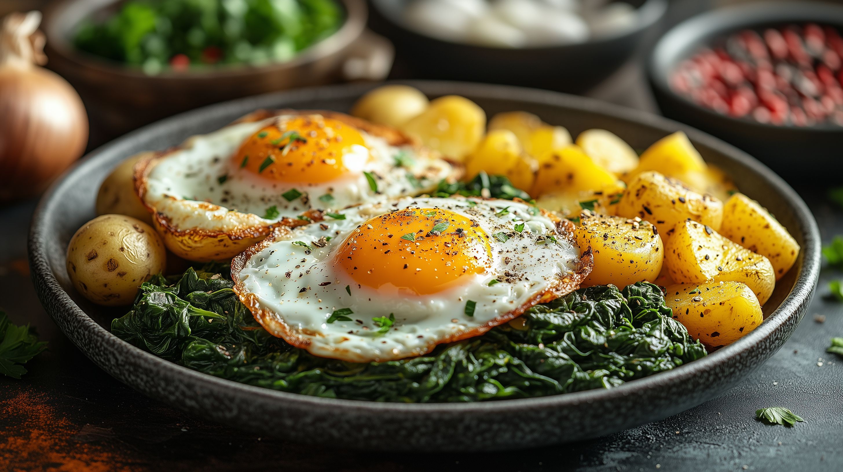Dieses herbstliche Frühstücks-Bowl-Rezept zeigt ein köstliches Gericht, das aus saftigen Spiegeleiern, cremigem Spinat und knusprig gebratenen Kartoffeln besteht. Die farbenfrohe Anordnung der Zutaten auf einem dunklen Teller schafft eine appetitliche und natürliche Optik. Das Foto eignet sich hervorragend als Stockfoto für Blogs, Newsletter oder Social-Media-Beiträge rund um gesunde Ernährung, Rezepte und Foodfotografie. Das Bild ist in hoher Auflösung und unter einer Creative-Commons-Lizenz verfügbar.