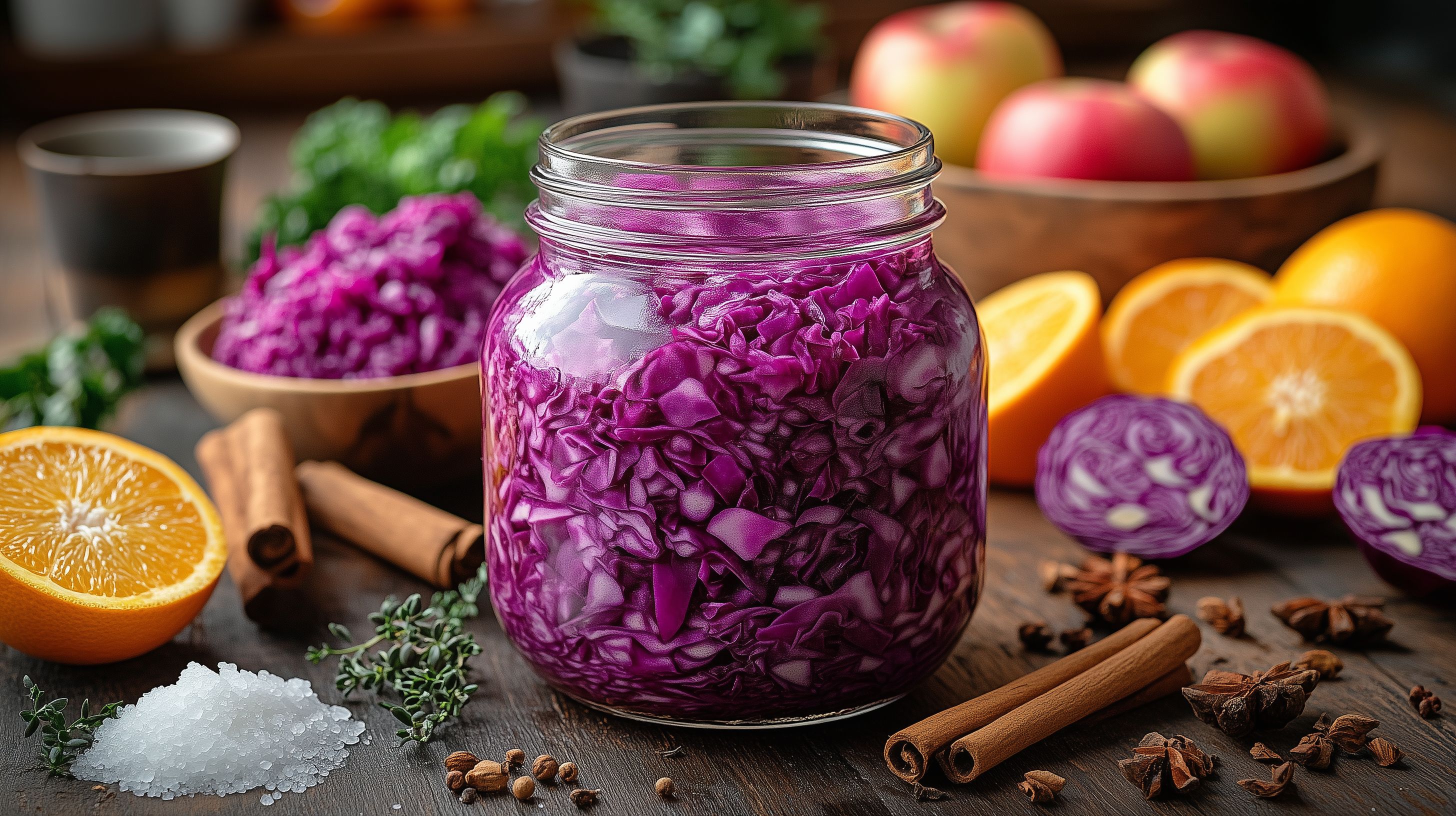 Dieses Foto zeigt ein Einmachglas gefüllt mit leckeren, fermentiertem Rotkraut-Sauerkraut. Umgeben ist es von Orangen, Zimt und weiteren dekorativen Elementen wie Kräutern. Die lebendige, violette Farbe des Sauerkrauts und die Kombination mit den frischen Zitrusfrüchten machen das Bild zu einem stimmungsvollen, herbstlichen Stillleben. Das Foto eignet sich hervorragend als hochwertiges, kostenloses Stockfoto für Blogs, Social-Media-Beiträge, Newsletter oder Werbematerialien rund um die Themen Ernährung, Kochen und Gesundheit. Die hochauflösende Datei ist unter einer Creative-Commons-Lizenz frei nutzbar.