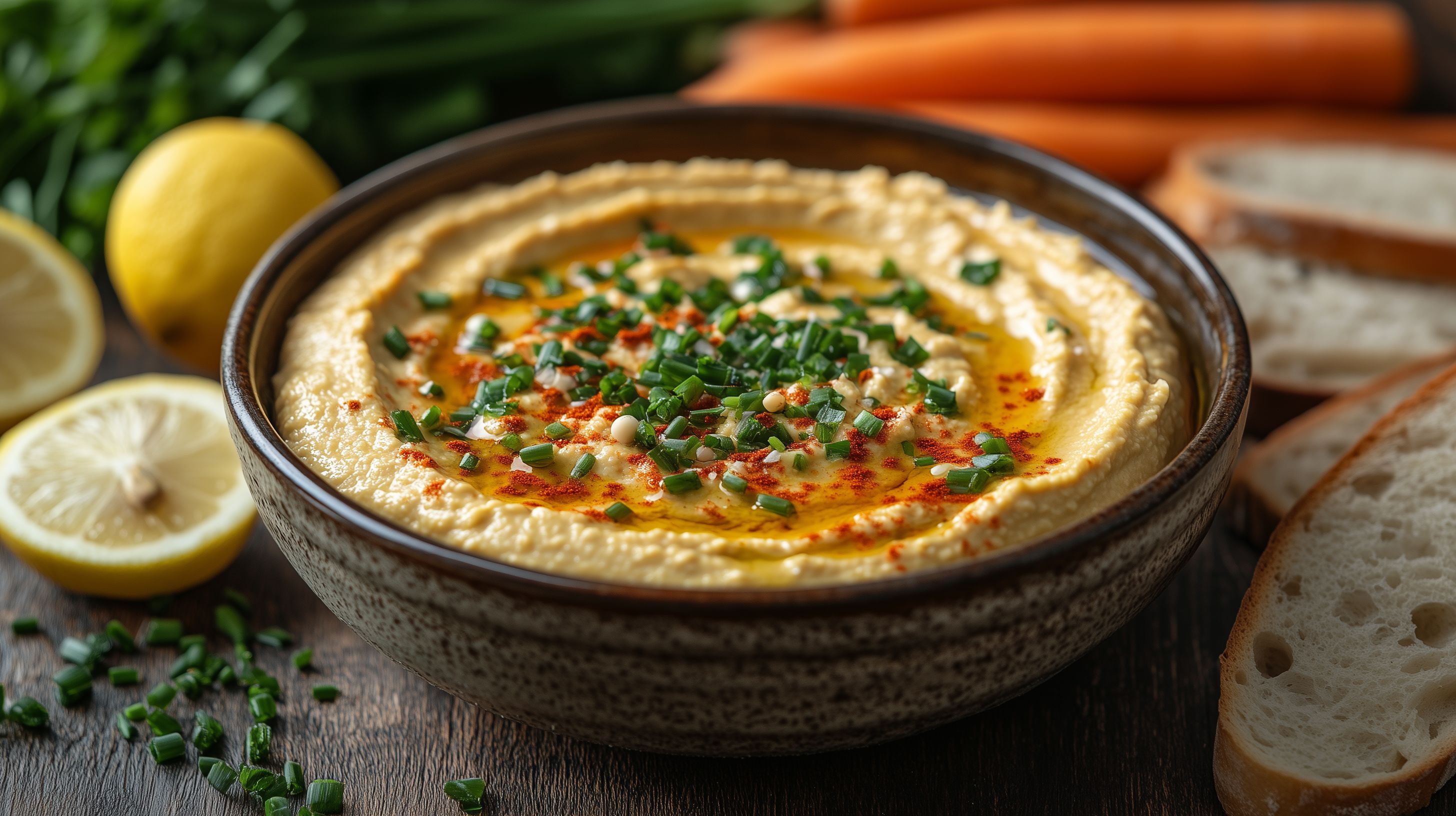 Das Bild zeigt einen Teller mit frisch zubereitetem, cremigem Hummus, garniert mit gehackten Frühlingszwiebeln und etwas Olivenöl. Neben dem Hummus liegen Möhrensticks, Brotscheiben und eine Zitronenhälfte als Beilagen. Der Hummus befindet sich in einer rustikalen Schale auf einem Holztisch, umgeben von den frischen Zutaten. Dieses klassische, mediterrane Gericht eignet sich perfekt als Vorspeise, Snack oder Beilage und kann sowohl von Vegetariern als auch Veganern genossen werden. Das hochwertige Stockfoto in hoher Auflösung kann ideal für Kochrezepte, Foodblogs, Restaurantwebsites oder Werbematerial eingesetzt werden und steht unter einer Creative-Commons-Lizenz zur Verfügung.