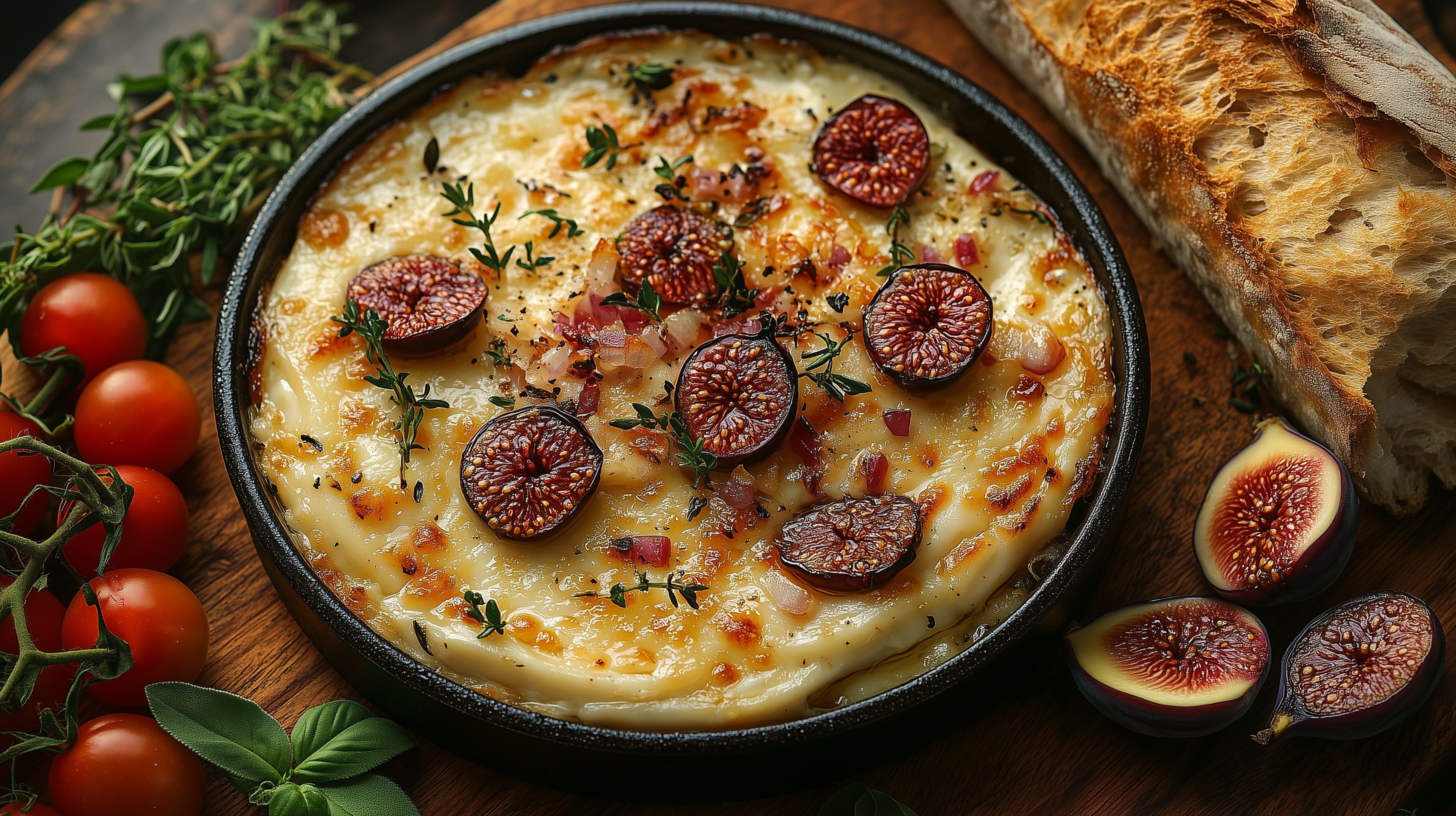 Das Bild zeigt einen appetitlich angerichteten Ofenlaib aus Camembert, der mit reifen, dunkelroten Feigen sowie frischen Thymianzweigen garniert ist. Die Komposition spielt mit der Gegenüberstellung der cremigen Käsemasse und der süßen, fruchtigen Feigen, die zusammen ein harmonisches Geschmackserlebnis versprechen. Der rustikale Holzteller und die natürlichen Farben verleihen dem Gericht eine gemütliche, mediterrane Ausstrahlung, die sich ideal für Genießermomente, Tapas-Buffets oder eine stimmungsvolle Grillparty eignet. Dieses hochauflösende Stockfoto steht unter einer Creative-Commons-Lizenz kostenlos zur Verfügung und kann beispielsweise in Blogs, Rezeptsammlungen oder für Werbezwecke eingesetzt werden.