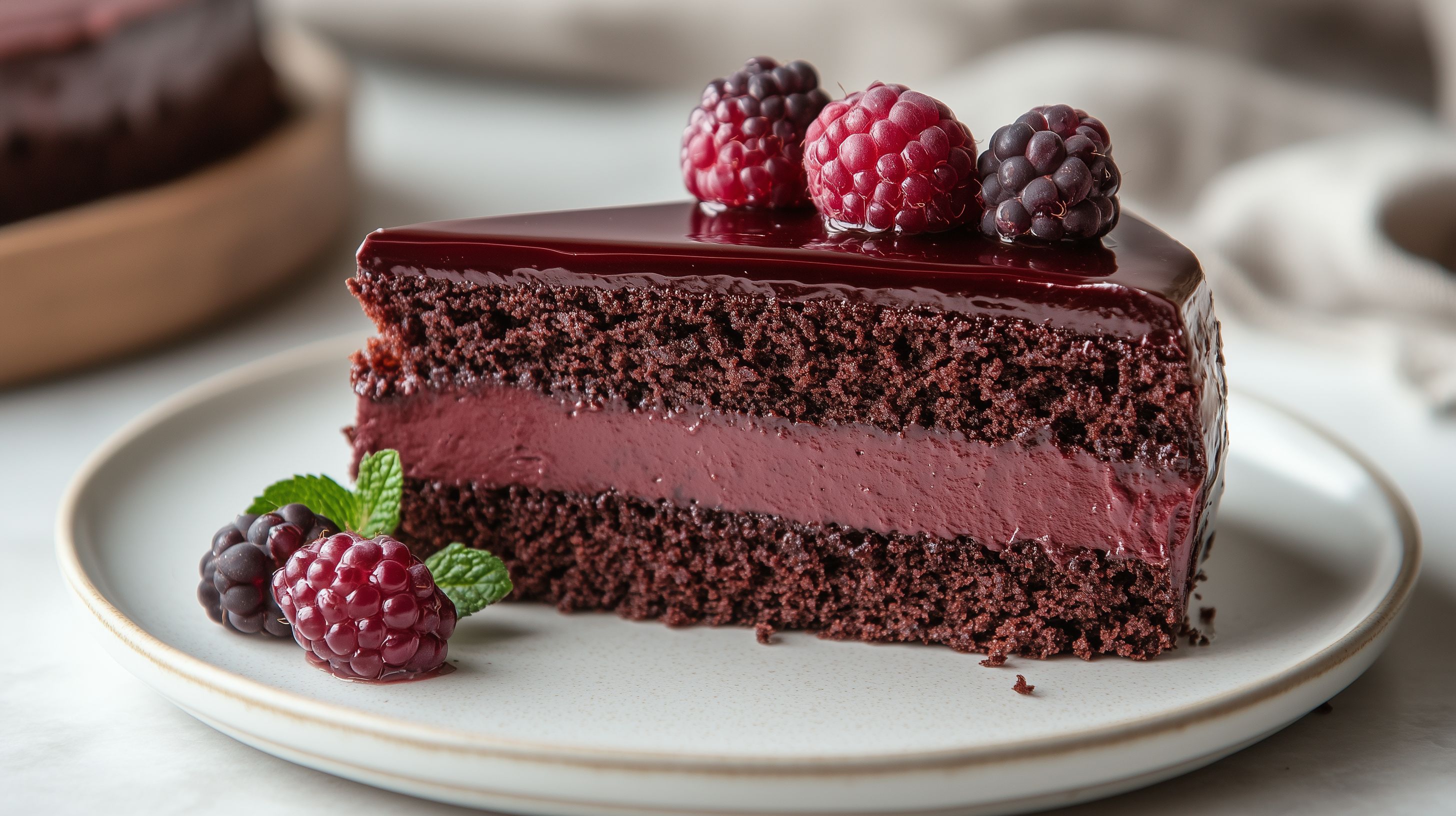Dieses Foto zeigt eine leckere Schokoladentorte mit einer saftigen, roten Beerenfüllung. Die Torte ist in Scheiben geschnitten und wurde dekorativ mit frischen Himbeeren, Brombeeren und einer Minzblatt-Garnierung angerichtet. Die dunkle Schokoladenglasur schimmert verlockend und bildet einen schönen Kontrast zu den roten Früchten. Dieses hochwertige Stockfoto eignet sich hervorragend für den Einsatz in Lebensmittel-Blogs, Kochbüchern, Werbeanzeigen oder Social-Media-Beiträgen zum Thema Backen, Desserts und leckere Köstlichkeiten. Das Foto ist in hoher Auflösung verfügbar und kann unter einer Creative-Commons-Lizenz kostenlos verwendet werden.