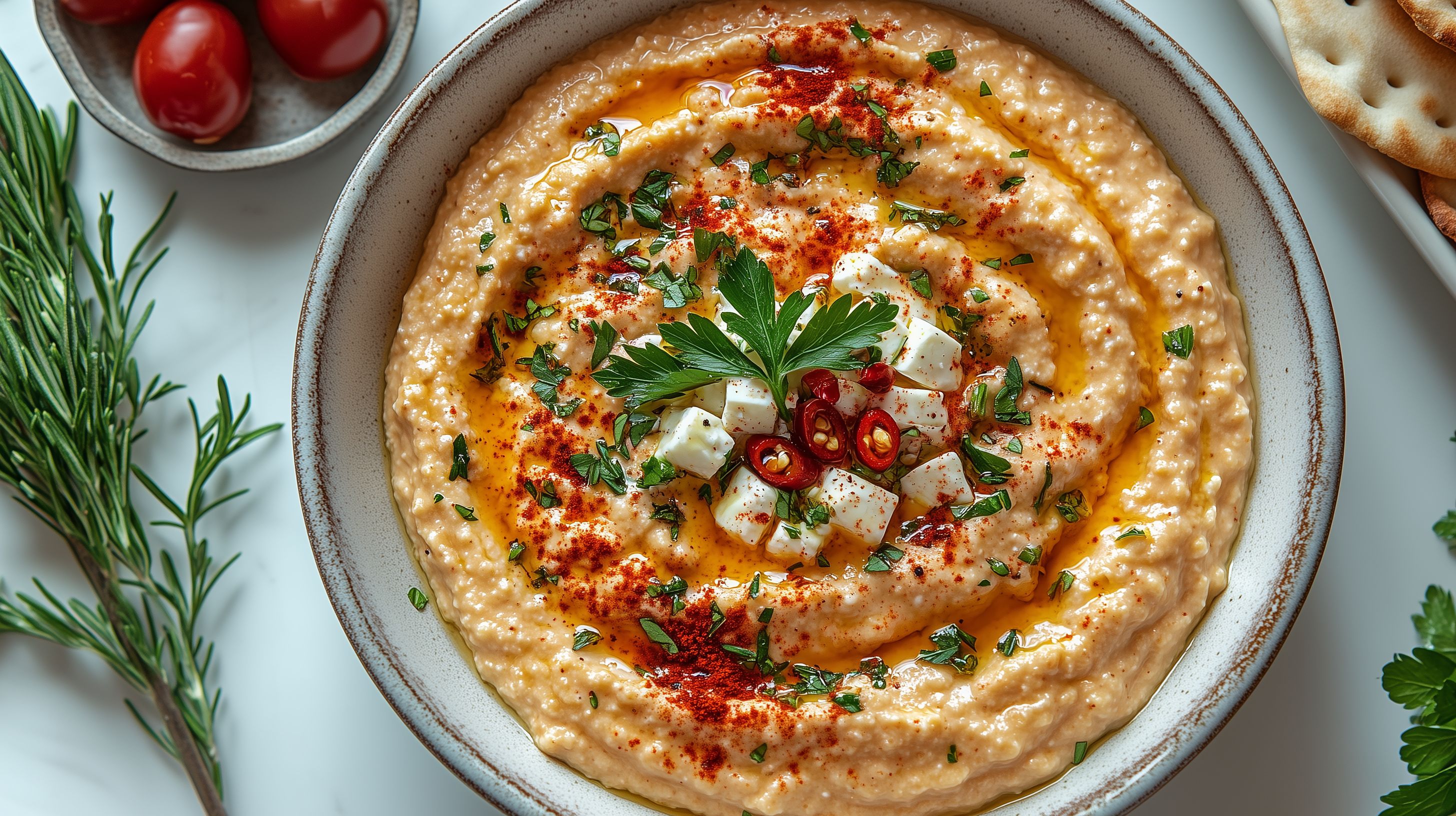 Dieses appetitanregende Foto zeigt einen würzigen Feta-Joghurt-Dip in einer rustikalen Schale. Der Dip ist mit frischen Kräutern, Chili-Gewürzen und Feta-Würfeln dekoriert, was einen mediterranen Geschmack und einen farbenfrohen, einladenden Auftritt verleiht. Das Bild eignet sich hervorragend für die Verwendung in Blogs, Newsletters, Social-Media-Beiträgen oder Werbematerialien rund um gesunde Ernährung, vegetarische Küche und Lebensmittelfotografie. Das hochauflösende, kostenfreie Stockfoto steht unter einer Creative-Commons-Lizenz zur Verfügung.
