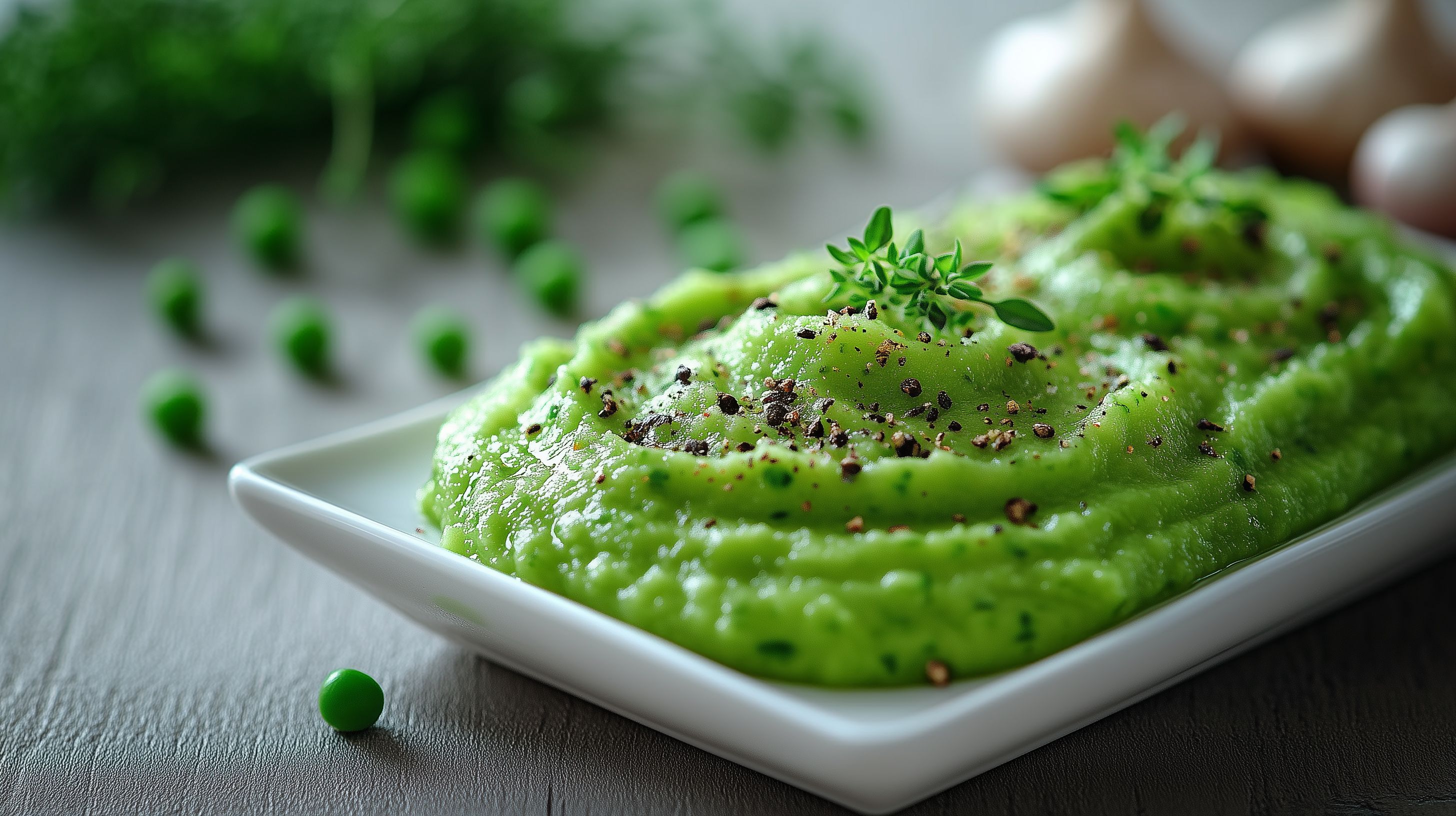 Das Bild zeigt ein appetitliches Erbsenpüree, das in einer eleganten weißen Schüssel angerichtet ist. Die cremige grüne Textur wird durch fein gehackte Kräuter wie Thymian oder Oregano akzentuiert. Das Gericht strahlt durch die intensive Farbe und die natürliche Präsentation eine gesunde und frische Ausstrahlung aus. Dieses kostenloses Stockfoto in hoher Auflösung eignet sich hervorragend für die Verwendung in Blogs, Newslettern, auf Social-Media-Kanälen oder in Werbekampagnen rund um das Thema gesunde Ernährung, vegetarische Rezepte oder Lebensmittelfotografie. Die lizenzfreie Nutzung unter Creative Commons-Bedingungen ermöglicht eine vielseitige Verwendung.