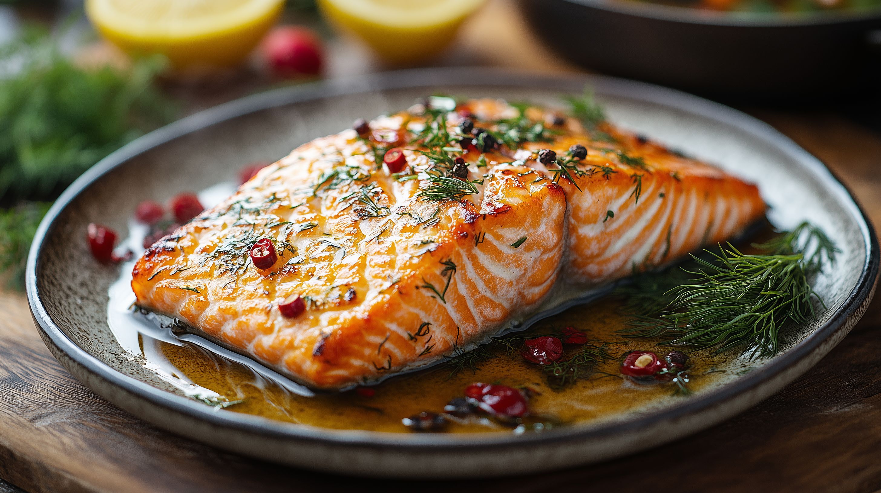 Das Foto zeigt ein appetitlich angerichtetes Lachsfilet, das auf einem Keramikteller serviert wird. Das Lachs-Steak ist goldbraun gebraten und mit frischen Kräutern wie Dill und roten Beeren wie Granatapfelkernen dekoriert. Die Zitronenscheiben neben dem Lachs verleihen dem Gericht eine erfrischende Note. Die Zusammenstellung der Zutaten und die Anordnung auf dem Teller wirken sehr stimmungsvoll und einladend. Dieses hochwertige Stockfoto eignet sich hervorragend für die Verwendung in Kochblogs, Restaurantwebsites, Menüpräsentationen oder Lebensmittelwerbung. Es ist in hoher Auflösung verfügbar und unter einer Creative-Commons-Lizenz kostenfrei nutzbar.