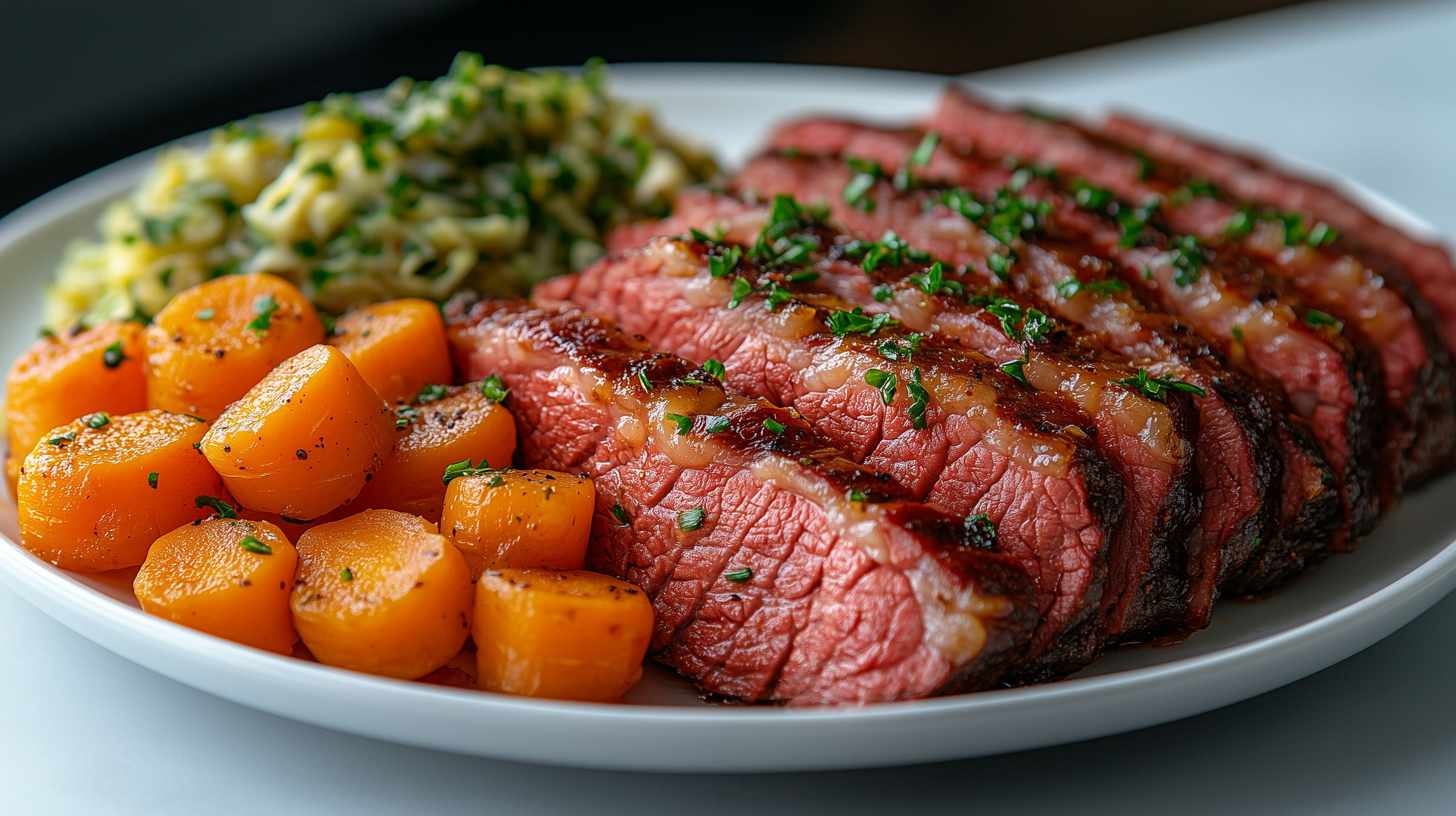 Dieses appetitlich angerichtete Foto zeigt ein leckeres Rindfleischgericht. Im Zentrum steht ein Stück zart geschnittenes, mit Kräutern mariniertes Rinderbrisket, umgeben von goldbraunen, gewürfelten Karotten. Dazu werden Reis oder Kartoffeln als Beilage serviert, um das saftige Fleisch optimal zur Geltung zu bringen. Das Gericht strahlt Wärme, Geschmack und Frische aus und eignet sich perfekt als Hauptspeise für ein gemütliches Dinner. Das hochwertige Stockfoto ist in hoher Auflösung verfügbar und kann unter der Creative-Commons-Lizenz kostenfrei für private und kommerzielle Zwecke wie Blogs, Social-Media-Posts oder Werbematerialien genutzt werden.