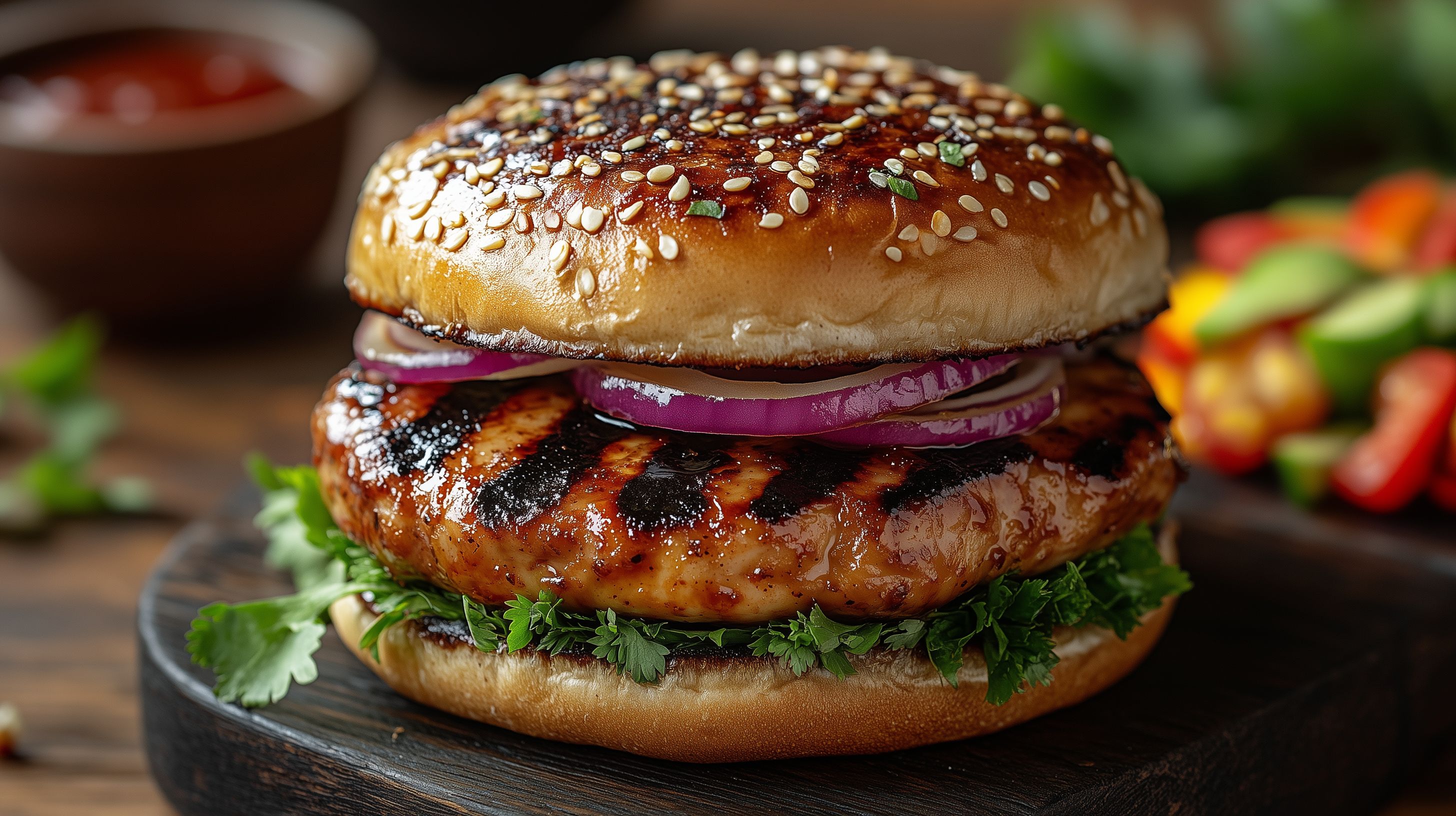 Dieses appetitliche Foto zeigt einen leckeren Asia-Burger mit einem knusprig gegrillten Patty, frischen Kräutern und Zwiebeln auf einem Sesam-Brötchen. Die Nahaufnahme lässt die Zutaten und die detailreiche Textur des Burgers perfekt zur Geltung kommen. Das Foto eignet sich ideal für Artikel und Werbung rund um Grillparties, Fastfood und asiatische Küche. Als kostenloses Stockfoto in hoher Auflösung unter Creative-Commons-Lizenz kann es frei genutzt werden.