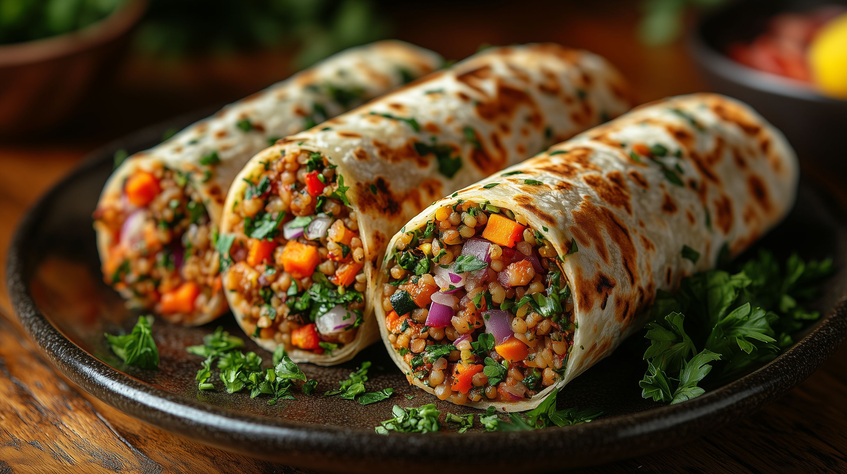 Das Foto zeigt einen appetitlichen Wrap, der mit frischem Gemüse wie Paprika, Zwiebeln und Kräutern sowie Bulgur gefüllt ist. Die Wraps sind in einer rustikalen Schale auf einem Holztisch angeordnet. Das Bild verströmt einen natürlichen, gesunden Eindruck und eignet sich hervorragend als Stockfoto für Foodblogger, Online-Magazine oder Werbekampagnen rund um gesunde Ernährung und leckere Rezeptideen. Das hochauflösende Foto steht unter einer Creative-Commons-Lizenz zum kostenlosen Download zur Verfügung.