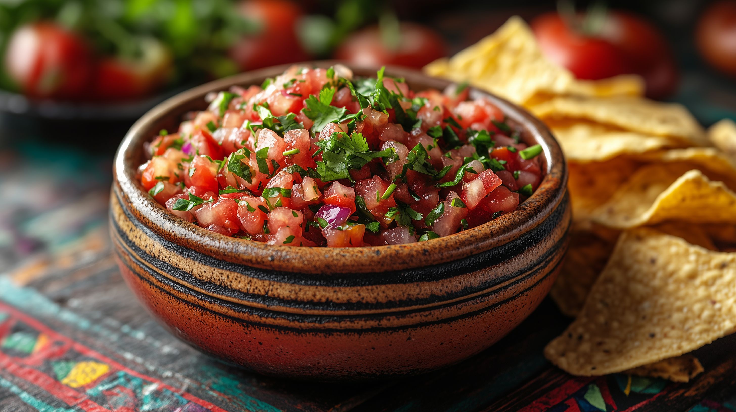 Dieses köstliche Foto zeigt eine rustikale Schüssel gefüllt mit frischem, hausgemachtem Tomatensalsa, serviert mit knusprigen Tortilla-Chips. Die leuchtend roten Tomaten, grünen Kräuter und bunte Gewürze verleihen dem Salsa ein appetitanregendes Erscheinungsbild. Die Schüssel steht auf einem bunten, gemusterten Untergrund, der den mexikanischen Charakter des Gerichts unterstreicht. Dieses Bild eignet sich perfekt als kostenloses Stockfoto für Blogs, Websites oder Social-Media-Beiträge, in denen gesunde, leckere und authentisch mexikanische Gerichte präsentiert werden sollen. Mit seiner hohen Auflösung und Creative-Commons-Lizenz ist es frei für vielfältige Nutzungen einsetzbar.