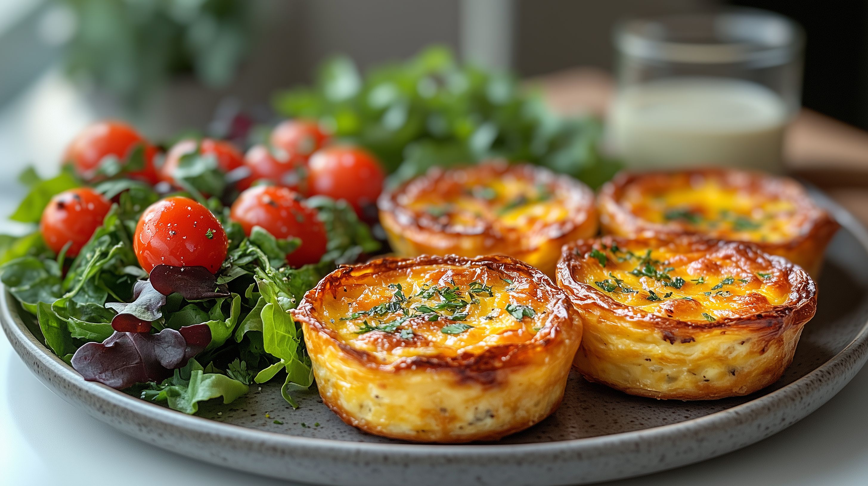 Dieses Foto zeigt einen appetitlichen Gemüseteller mit mini-Quiches. Die kleinen, knusprigen Quiches sind mit Eiern, Käse und anderen Zutaten gefüllt und sehen sehr verlockend aus. Umrahmt werden sie von einem bunten Salat mit frischen Tomaten und grünen Blättern in einer rustikalen Schüssel. Das Foto ist perfekt für den Einsatz in Blogs, Social-Media-Posts, Newslettern oder Werbekampagnen rund um gesunde Ernährung, Mittagessen oder Snacks. Es ist ein hochwertiges, kostenloses Stockfoto in hoher Auflösung, das unter einer Creative-Commons-Lizenz steht.