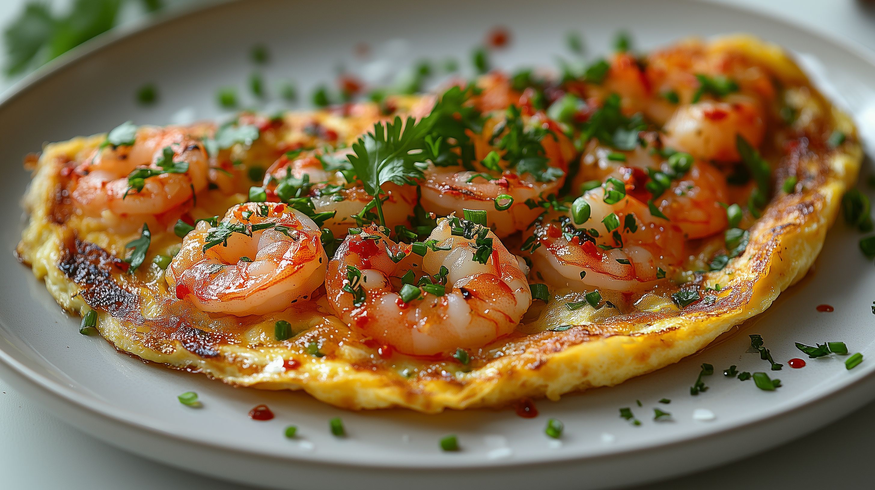 Das Bild zeigt ein appetitlich angerichtetes Omelett mit gebratenen Garnelen und frischen Kräutern. Die Speise wird auf einem weißen Teller angerichtet, der einen rustikalen Charakter verleiht. Die Garnelen sind goldbraun angebraten und liegen inmitten des fluffigen Omeletts, das mit grünen Kräutern und roten Chilischoten dekoriert ist. Das Gericht strahlt eine warme, sättigende Atmosphäre aus und eignet sich hervorragend als Hauptspeise zum Frühstück, Brunch oder Mittagessen. Dieses hochwertige, kostenlose Stockfoto in hoher Auflösung kann beispielsweise für Foodblogs, Kochrezepte, Werbekampagnen oder Restaurantwebseiten verwendet werden.